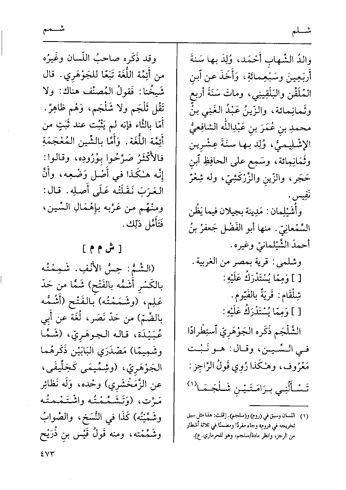 وَقد ذَكَره صاحبُ اللّسان وغَيرُه من أئِمَّة اللُّغَة تَبَعًا للجَوْهَرِي. قَالَ شَيْخُنا: فَقولُ المُصنِّف هُنَاكَ: وَلَا تَقُل ثَلْجَم وَلَا شَلْجَم، وَهْم ظاهِرٌ. أَمّا بالثَّاء فَإِنَّهُ لم يَثْبُت عِنْد ثَبَتٍ من أئِمَّة اللَّغة. وَأَمَّا بالشِّين المُعْجَمَةِ فالأَكْثَرُ صَرَّحُوا بِوُرُودِه، وَقَالُوا: إِنَّه هكَذا فِي أصْل وَضْعِه، وأَنَّ العَرَبَ نَقَلَتْه عَلَى أَصْلِه. قَالَ: ومِنْهُم من عَرًّبه بإِهْمَالِ السِّين، فَتَأَمَّل ذلِك.