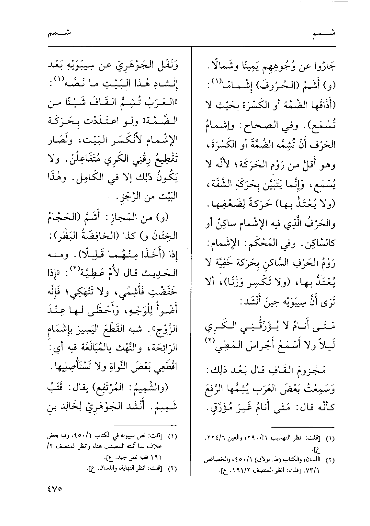 جَارُوا عَن وُجُوهِهِم يَمِيناً وشَمالاً. (و) أَشَمَّ (الحُرُوفَ) {إِشْماماً: (أَذَاقَها الضَّمَّة أَو الكَسْرَة بحَيْث لَا تُسْمَع) . وَفِي الصِّحَاح:} وإِشمامُ الحَرْف أَنْ {تُشِمَّه الضَّمَّةَ أَو الكَسْرَةَ، وَهُوَ أَقلُّ من رَوْمِ الحَرَكَة؛ لأَنَّه لَا يُسْمَع، وَإِنَّما يَتَبَيَّن بِحَرَكَةِ الشَّفَة، (وَلَا يُعْتَدُّ بهَا) حَرَكةً لِضَعْفِها. والحَرْفُ الَّذِي فِيهِ} الإِشْمام ساكِنٌ أَو كالسَّاكِن. وَفِي المُحْكَم: الإِشْمام: رَوْمُ الحَرْفِ السَّاكنِ بِحَرَكة خَفِيَّة لَا يُعْتَدُّ بهَا، (وَلَا تَكْسِر وَزْناً) ، أَلا تَرَى أَنَّ سِيبَوَيْه حِينَ أَنْشَد: