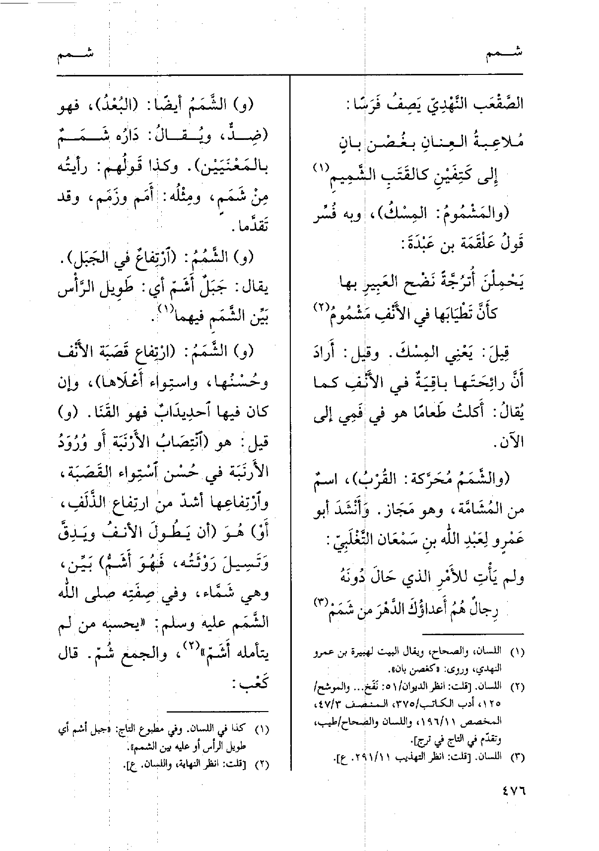 (و) الشَّمَمُ: (ارْتِفاع قَصَبَة الأَنْف وحُسْنُها، واستِواء أَعْلاَها) ، وَإِن كَانَ فِيهَا اْحدِيدَابٌ فَهُوَ القَنَا. (و) قيل: هُوَ (اْنْتِصَابُ الأَرْنَبَة أَو وُرُوَدُ الأَرنَبَة فِي حُسْن اْسْتِواء القَصَبَة، واْرْتِفاعِها أشدّ من ارتِفاع الذَّلَفِ، أَوْ) هُوَ (أَن يَطُولَ الأنفُ ويَدِقَّ وَتَسِيلَ رَوْثَتُه، فَهُوَ أَشَمُّ) بَيِّن، وَهِي} شَمَّاء، وَفِي صِفَتِه صلى الله الشَّمَم عَلَيْهِ وَسلم: " يحسبه من لم يتأمله أَشَمّ "، وَالْجمع! شُمّ. قَالَ كَعْب: