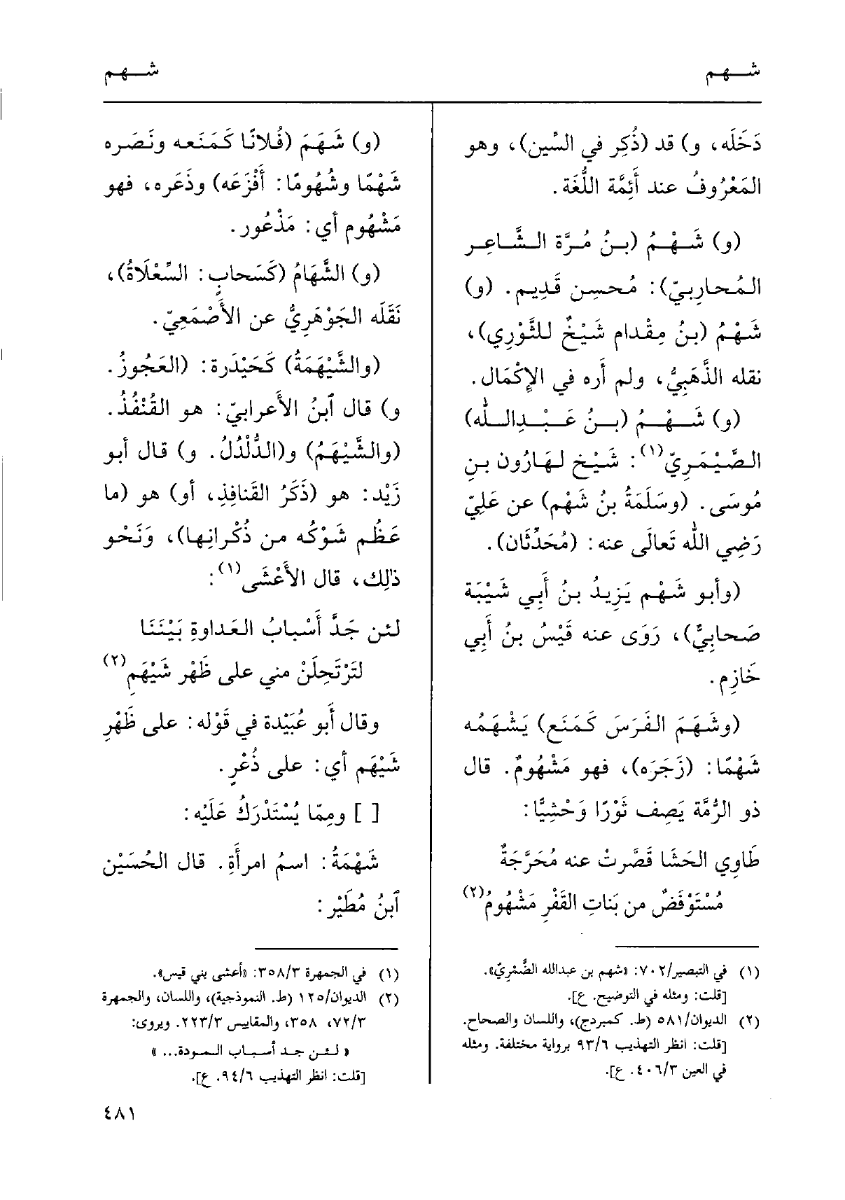 (و) شَهْمُ (بنُ مُرَّة الشَّاعِر المُحارِبيّ) : مُحسِن قَدِيم. (و) شَهْمُ (بنُ مِقْدام شَيْخٌ للثَّوْرِي) ، نَقله الذَّهَبِيُّ، وَلم أَره فِي الإِكْمَال.