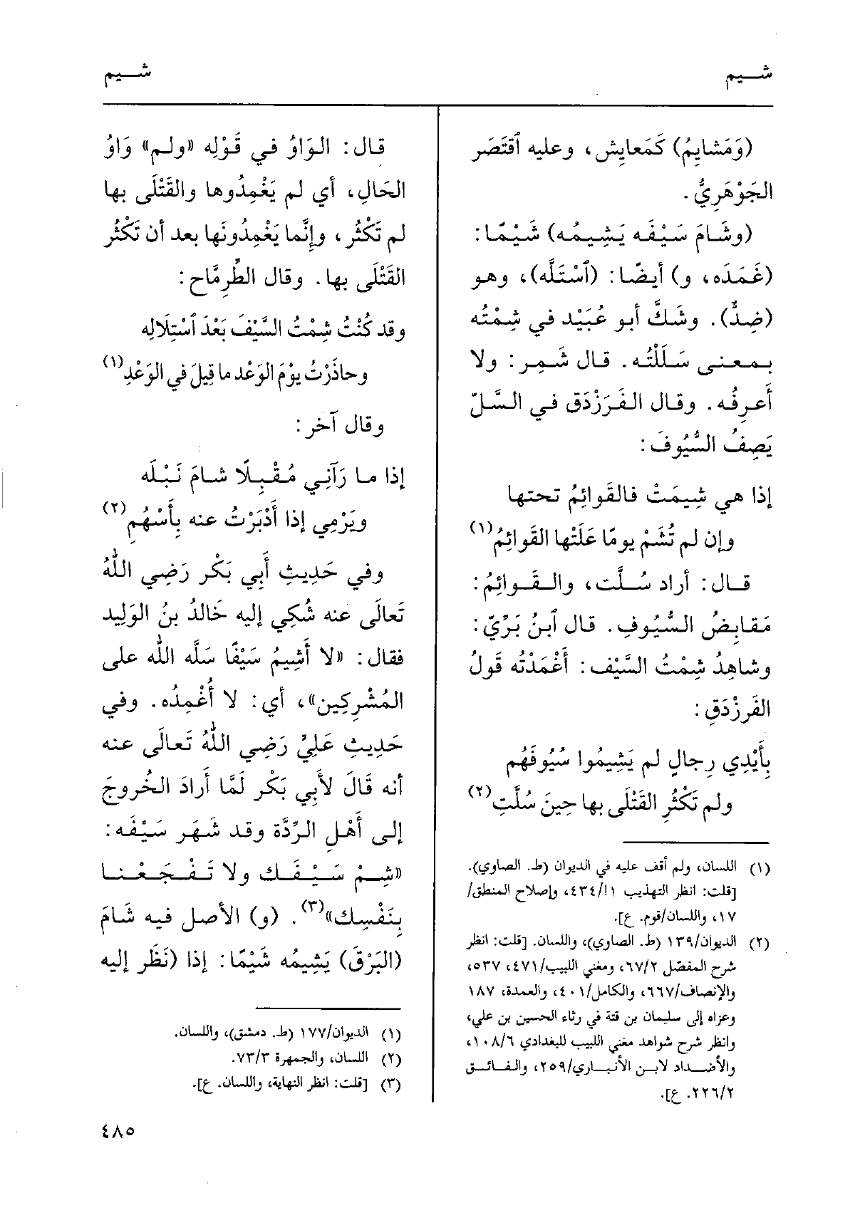 قَالَ: أَرَادَ سُلَّت، والقَوائِمُ: مَقابِضُ السُّيُوفِ. قَالَ اْبنُ بَرِّيّ: وشاهِدُ {شِمْتُ السَّيْف: أَغْمَدْتُه قَولُ الفَرزْدَقِ: