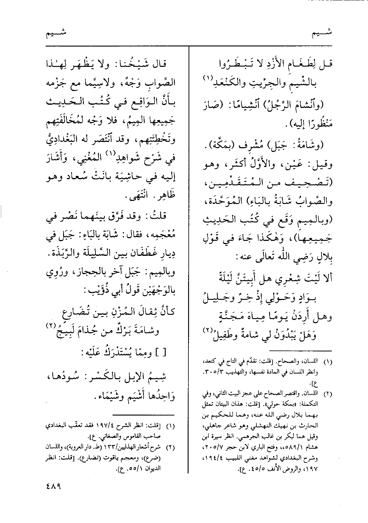 قَالَ شَيْخُنا: وَلَا يَظْهَر لِهذا الصَّوابِ وَجْهٌ، وَلَا سِيَّما مَعَ جَزْمه بأَنَّ الوَاقِع فِي كُتُب الحَدِيث جَمِيعِها المِيمُ، فَلَا وَجْه لمُخَالَفَتِهم وتَخْطِئَتِهم، وَقد اْنْتَصَر لَهُ البَغْدادِيُّ فِي شَرْح شَواهِدِ المُغْنِي، وَأَشَارَ إِلَيْهِ فِي حاشِيَة بانَتْ سُعاد وَهُوَ ظَاهِر. انْتَهَى.