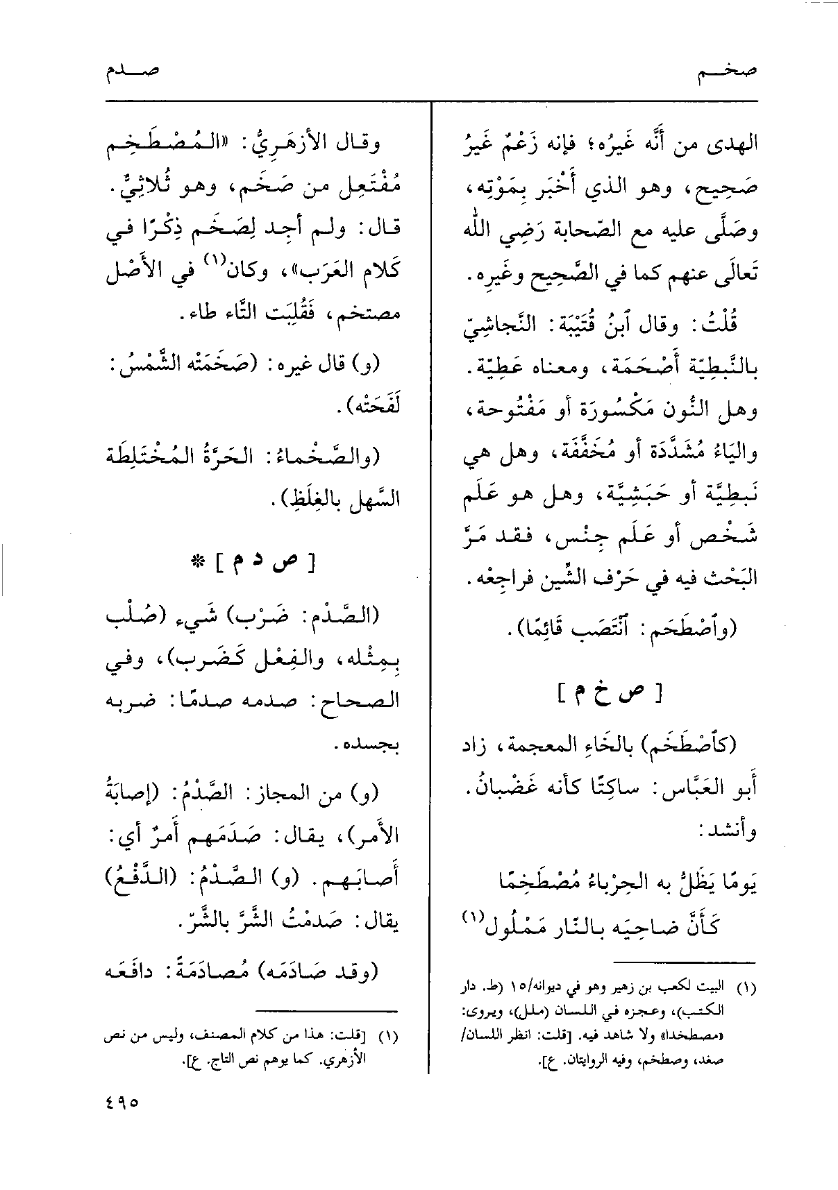 وَقَالَ الأزهَرِيُّ: " المُصْطَخِم مُفْتَعِل من صَخَم، وَهُوَ ثُلاثِيٌّ. قَالَ: وَلم أجِد لِصَخَم ذِكْراً فِي كَلام العَرَب "، وَكَانَ فِي الأَصْل مصتخم، فَقُلِبَت التَّاء طاء.