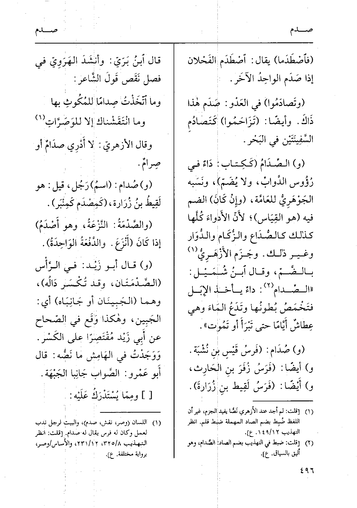 (و) الصِّدَامُ (كَكِتاب: دَاءٌ فِي رُؤُوس الدّوابِّ، وَلَا يُضَمّ) ، ونَسَبه الجَوْهَرِيُّ للعَامَّة، (وإِنْ كَانَ) الضَّم فِيهِ (هُوَ القِيَاس) ؛ لأَنّ الأَدواءَ كُلَّها كَذَلِك كالصُّدَاع والزُّكَام والدُّوَار وَغير ذَلِك. وجَزَم الأَزْهَرِيُّ بالضَّمّ، وَقَالَ اْبنُ شُمَيْل: " الصِّدام: داءٌ يَأْخُذ الإِبَل فتَخْمَصُ بُطونُها وتَدَعُ المَاءُ وَهِي عِطاشٌ أَيَّاماً حَتَّى تَبْرَأَ أَو تَمُوت ".