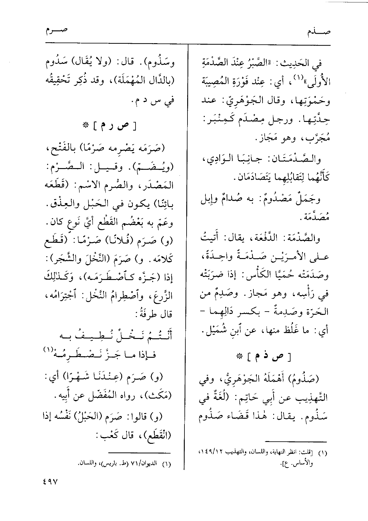 (صَذُومُ) أَهْمَلَهُ الجَوْهَرِيُّ، وَفِي التَّهذِيب عَن أَبِي حَاتِم: (لُغَةٌ فِي سَذُوم. يُقَال: هَذَا قَضَاء صَذُوم وسَذُوم) . قَالَ: (وَلَا يُقَال) سَدُوم (بالدَّال المُهْمَلَة) ، وَقد ذُكِر تَحْقِيقُه فِي س د م.