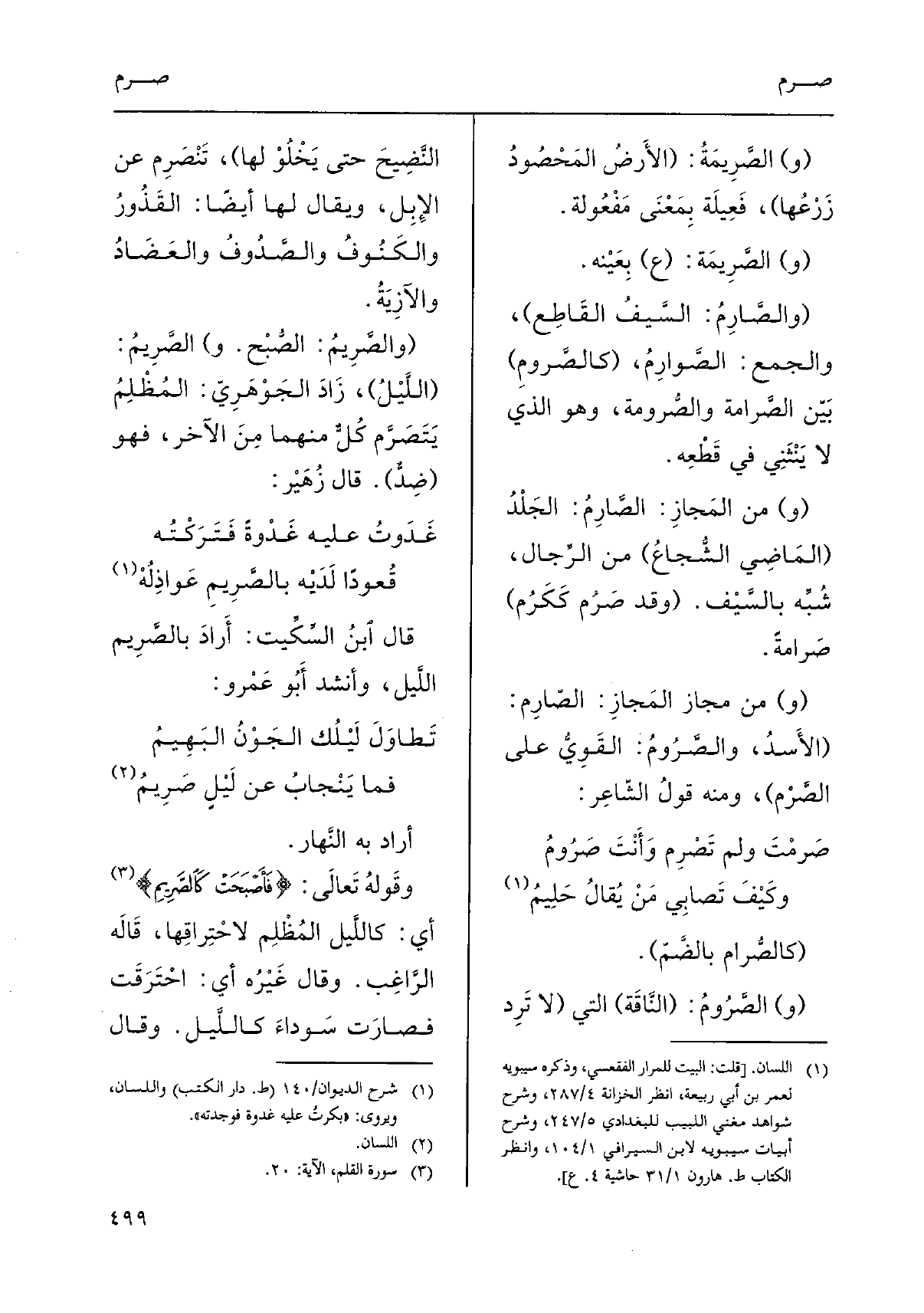 وقَولهُ تَعالَى: {فَأَصْبَحت كالصريم} أَي: كاللَّيل المُظْلِم لاحْتِراقِها، قَالَه الرَّاغِب. وَقَالَ غَيْرُه أَي: احْتَرَقَت فصارَت سَوداءَ كاللَّيل. وَقَالَ