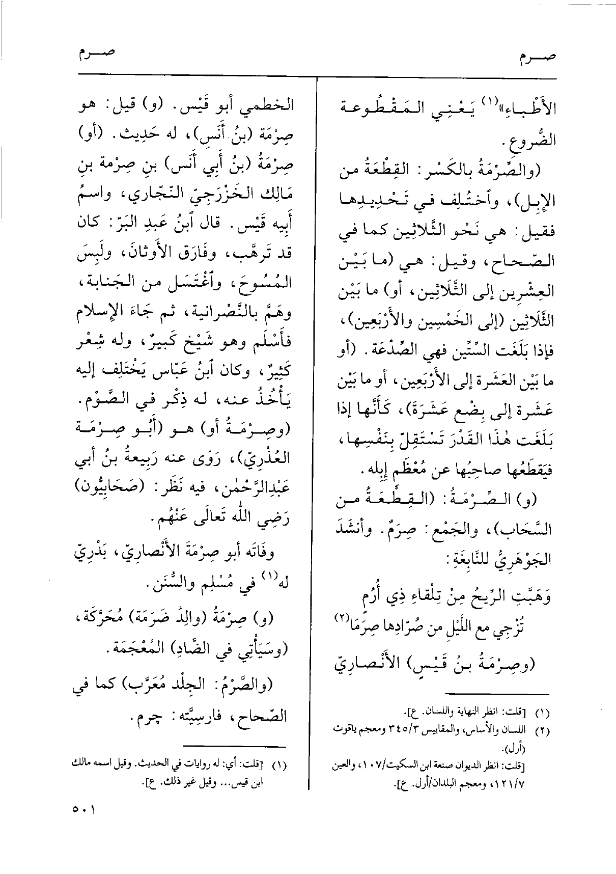 (والصَّرمَةُ بالكَسْر: القِطْعَةُ من الإِبِل) ، واختُلِف فِي تَحْدِيدِها فَقيل: هِيَ نَحْو الثَّلاثِين كَمَا فِي الصّحاح، وَقيل: هِيَ (مَا بَيْن العِشْرِين إِلَى الثَّلاَثِين، أَو) مَا بَيْن الثَّلاَثِين (إِلَى الخَمْسِين والأَرْبَعِين) ، فَإِذا بَلَغَت السِّتِّين فَهِيَ الصِّدْعَة. (أَو مَا بَيْن العَشَرة إِلَى الأَرْبَعِين، أَو مَا بَيْن عشَرة إِلَى بَضْع عَشَرةَ) ، كَأَنَّها إِذا بَلَغَت هذَا القَدْرَ تَسْتَقِلّ بِنَفسَها، فيقطَعُها صاحِبُها عَن مُعْظَم إبِله ,