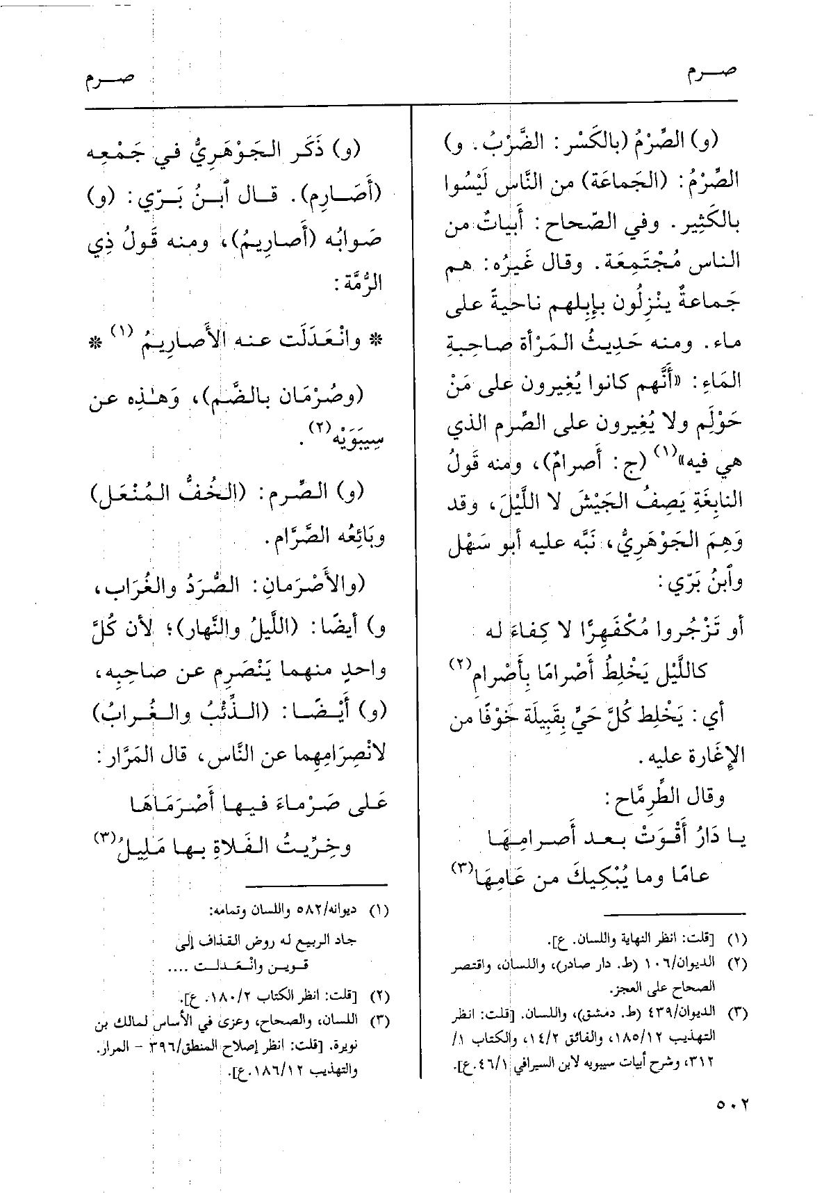 (و) الصِّرْمُ (بالكَسْر: الضَّرٍ بُ. و) الصِّرْمُ: (الجَماعَة) من النَّاس لَيْسُوا بالكَثِير. وَفِي الصّحاح: أَبياتٌ من النَّاس مُجْتَمِعَة. وَقَالَ غَيرُه: هم جَماعةٌ يَنْزِلُون بإِبِلهم نَاحيَة على مَاء. وَمِنْه حَدِيثُ المَرْأة صاحِبةِ المَاءِ: " أَنَّهم كَانُوا يُغِيرون على مَنْ حَوْلِمَ وَلَا يُغِيرون على الصِّرم الَّذِي هِيَ فِيهِ " (ج: أَصرامٌ) ، وَمِنْه قَولُ النَابِغَةِ يَصِفُ الجَيْشَ لَا اللَّيْلَ، وَقد وَهِمَ الجَوْهَرِيُّ، نَبَّه عَلَيْهِ أَبُو سَهْل وابنُ بَرّي: