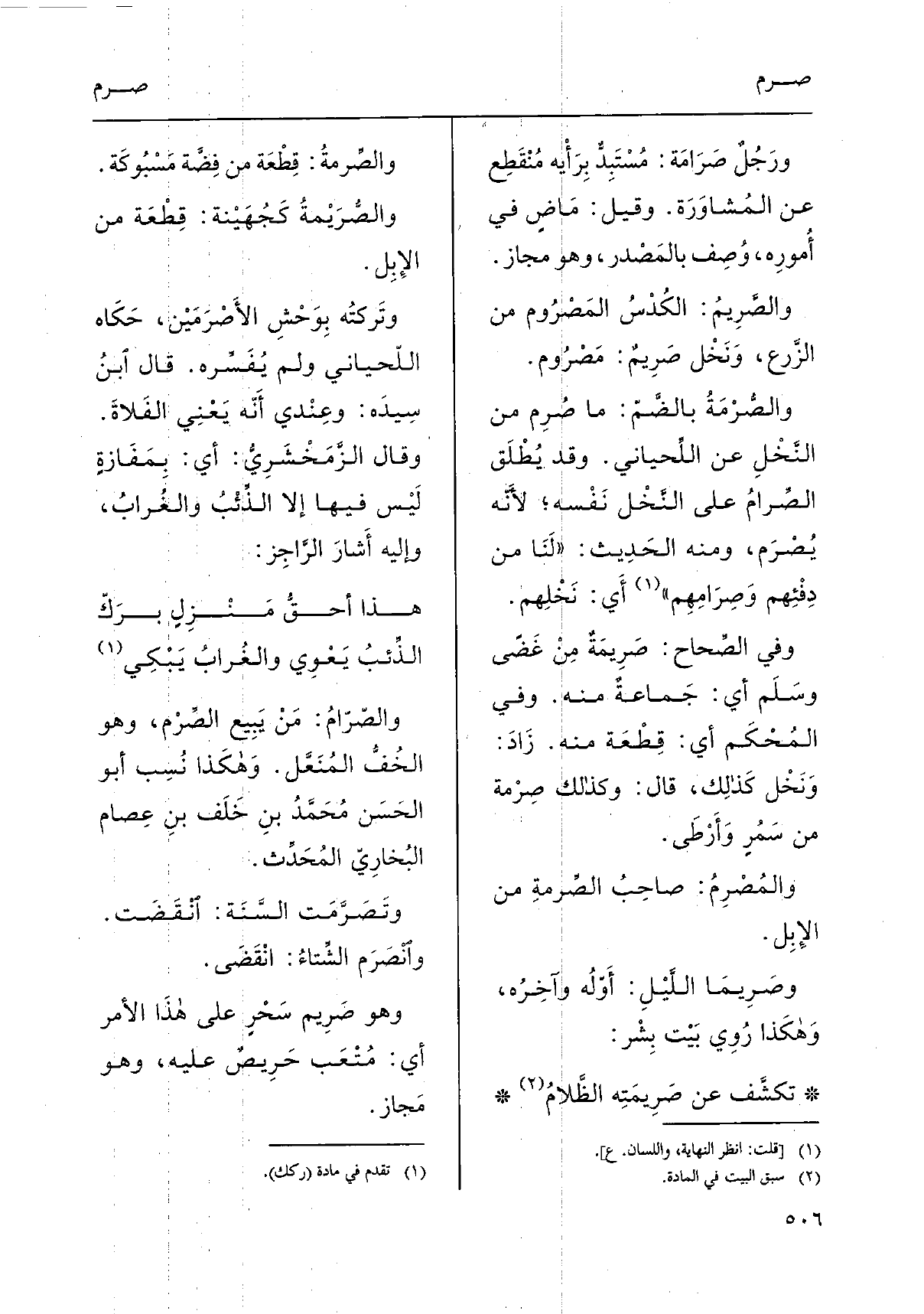 والصُّرْمَةُ بالضَّمّ: مَا صُرِم من النَّخْلِ عَن اللَّحياني. وَقد يُطْلَق الصِّرامُ على النَّخْل نَفْسه؛ لأنَّه يُصْرَم، وَمِنْه الحَدِيث: " لَنَا من دِفْئِهم وَصِرَامِهِم " أَي: نَخْلِهم.