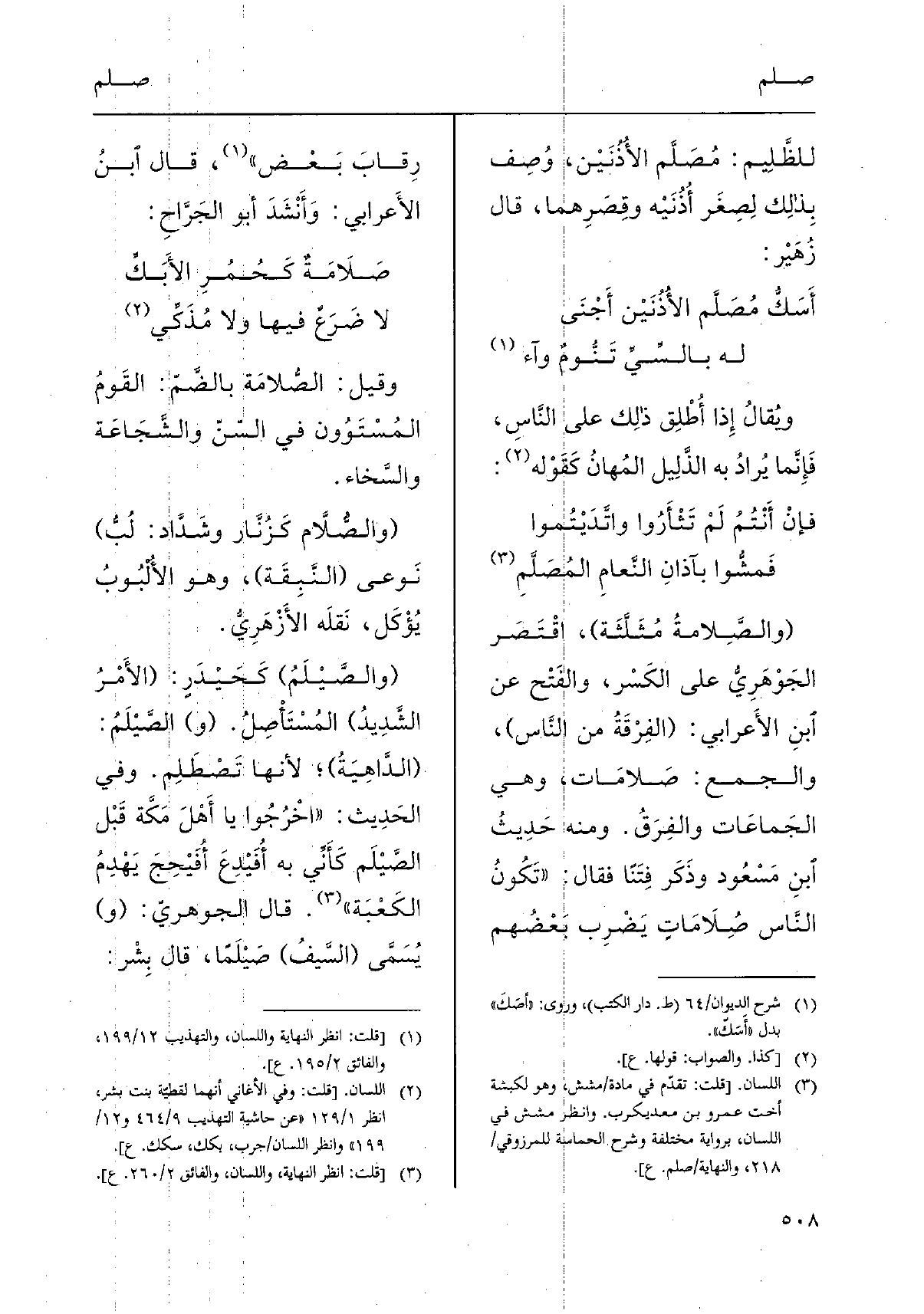 (والصَّلامةُ مُثَلَّثَة) ، اقْتَصَر الجَوْهَرِيُّ على الكَسْر، والفَتْح عَن ابنِ الأَعرابي: (الفِرْقَةُ من النَّاس) ، وَالْجمع: صَلامَات، وَهِي الجَماعَات والفِرَقُ. وَمِنْه حَدِيثُ ابنِ مَسْعُود وذَكَر فِتَنًا فَقَالَ: " تَكُونَ النَّاس صُلاَمَاتٍ يَضْرِب بَعْضُهم رِقابَ بَعْض "، قَالَ ابنُ الأَعرابي: وَأَنْشَدَ أَبُو الجَرَّاحِ: