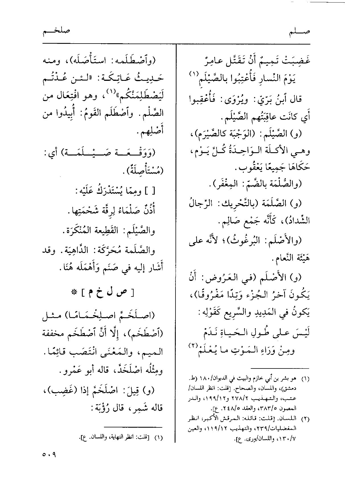 (اصلَخَمَّ اصلِخْمَاماً) مثل (اْصْطَخَم) ، إِلاَّ أَنَّ اْصْطَخَم مُخَفّفَة الْمِيم، والمَعْنَى انْتَصَب قائِماً. ومِثْلُه اصْلَخَدَّ، قَالَه أَبُو عَمْرو.