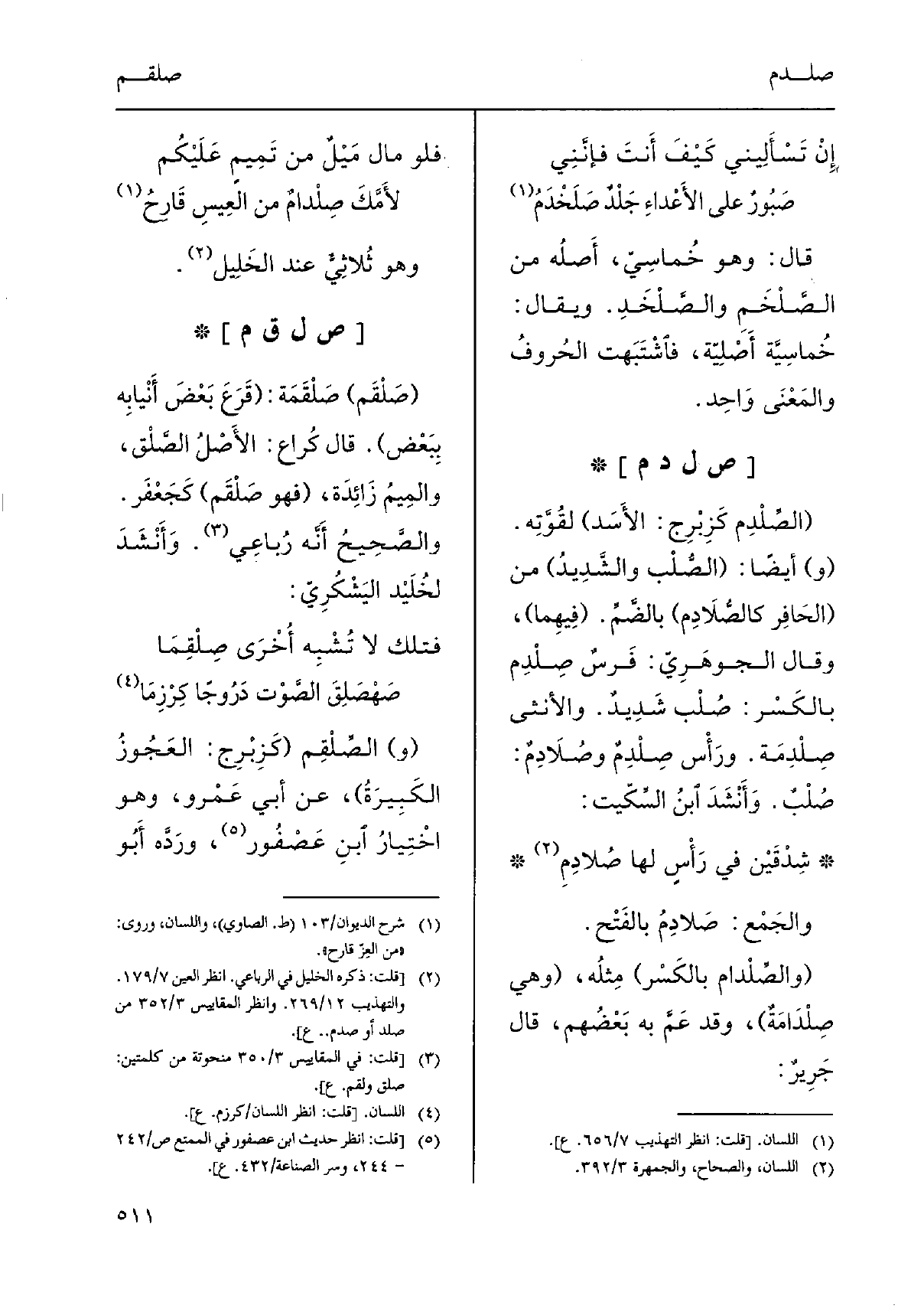 قَالَ: وَهُوَ خُماسِيّ، أَصلُه من الصَّلْخَم والصَّلْخَدِ. وَيُقَال: خُماسِيَّة أَصْلِيّة، فاْشْتَبَهت الحُروفُ والمَعْنَى وَاحِد.