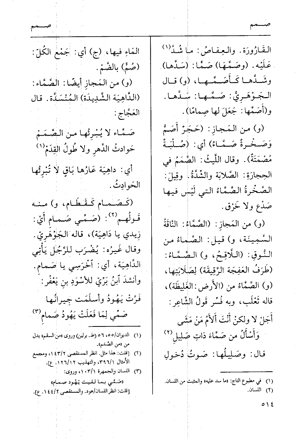 (و) من المَجازِ: (الصَّمَّاءُ: النَّاقَةُ السَّمِينَة، و) قيل: الصَّمَّاءُ: من النُّوقِ: (اللّاقِحُ، و) الصَّمَّاءُ (طَرَفُ العَفِجَة الرَّقِيقَة) لِصَلاَبَتِها، (و) الصَّمَّاءُ من (الأَرض: الغَلِيظَة) ، قَالَه ثَعْلَب، وَبِه فُسِّر قَولُ الشَّاعِر: