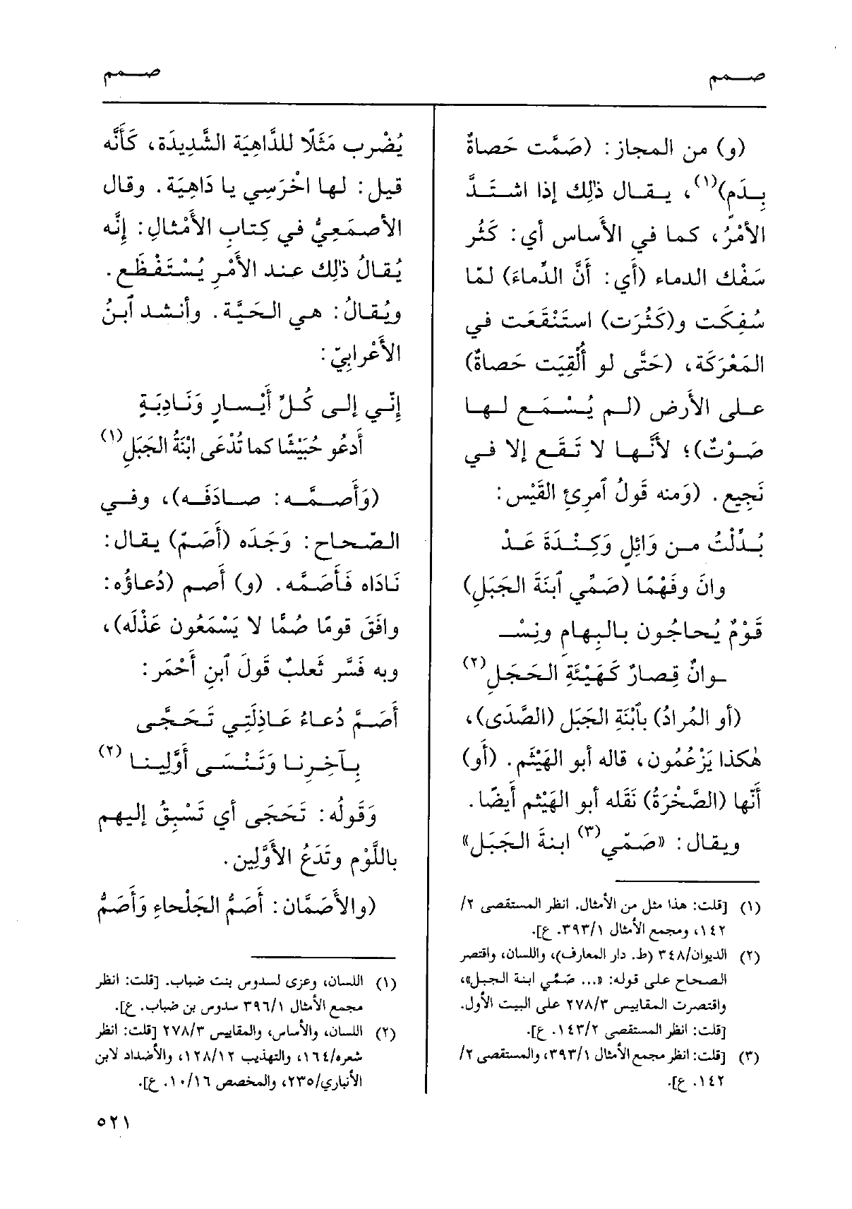 وَيُقَال: " صَمّي ابنةَ الجَبَل " يُضْرب مَثَلاً للدَّاهِيَة الشَّدِيدَة، كَأَنَّه قيل: لَهَا اخْرَسِي يَا دَاهِيَة. وَقَالَ الأصمَعِيُّ فِي كِتابِ الأَمْثالِ: إِنَّه يُقالُ ذلِك عِنْد الأَمْرِ يُسْتَفْظَع. ويُقالُ: هِيَ الحَيَّة. وَأنْشد اْبنُ الأَعْرابِيّ:
