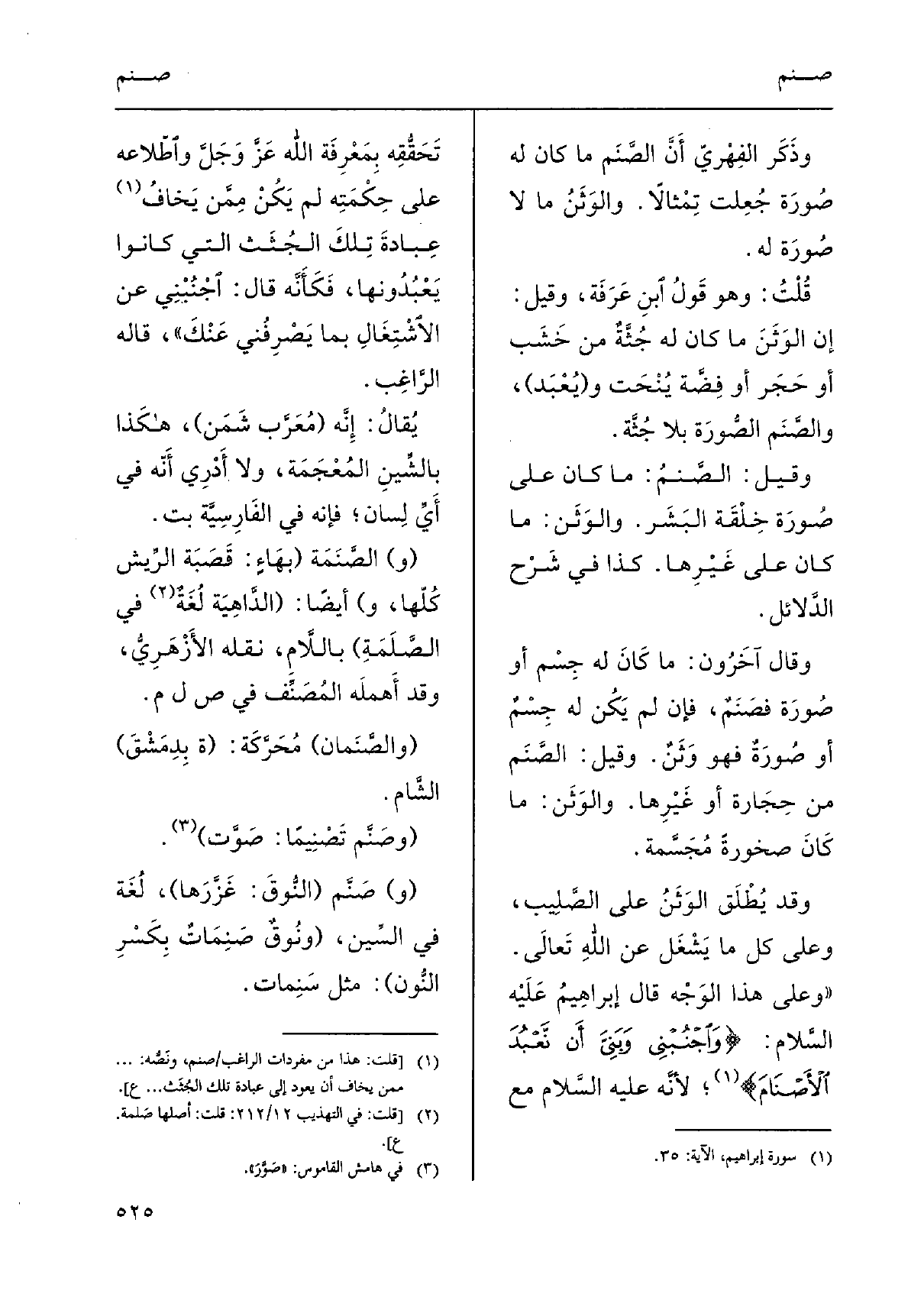 وذَكَر الفِهْريّ أَنّ الصَّنَم مَا كَانَ لَهُ صُورَة جُعِلت تِمْثالاً. والوَثَنُ مَا لَا صُورَة لَهُ.