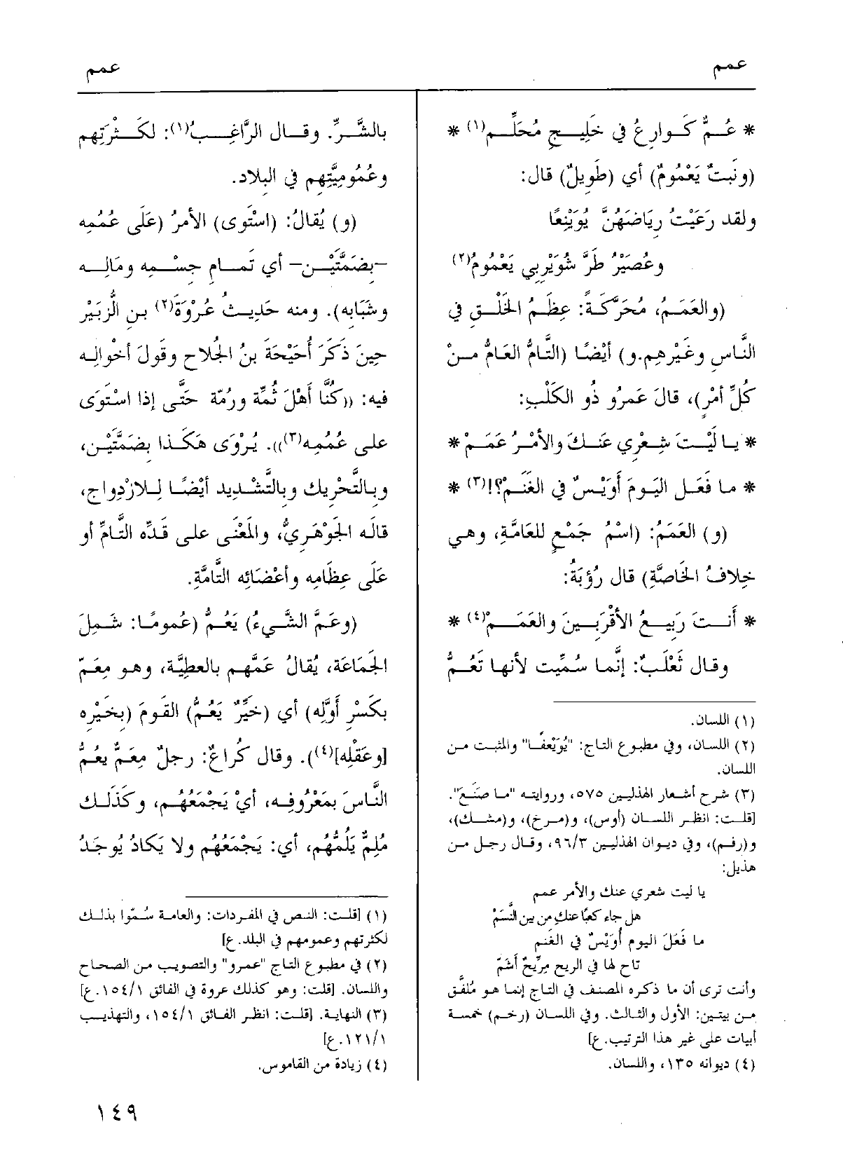 وَقَالَ ثَعْلَبٌ: إنَّما سُمِّيت لِأَنَّهَا تَعُمُّ بالشَّرِّ. وَقَالَ الرَّاغِبُ: لكَثْرَتِهم} وعُمُومِيَّتِهم فِي البِلاد.