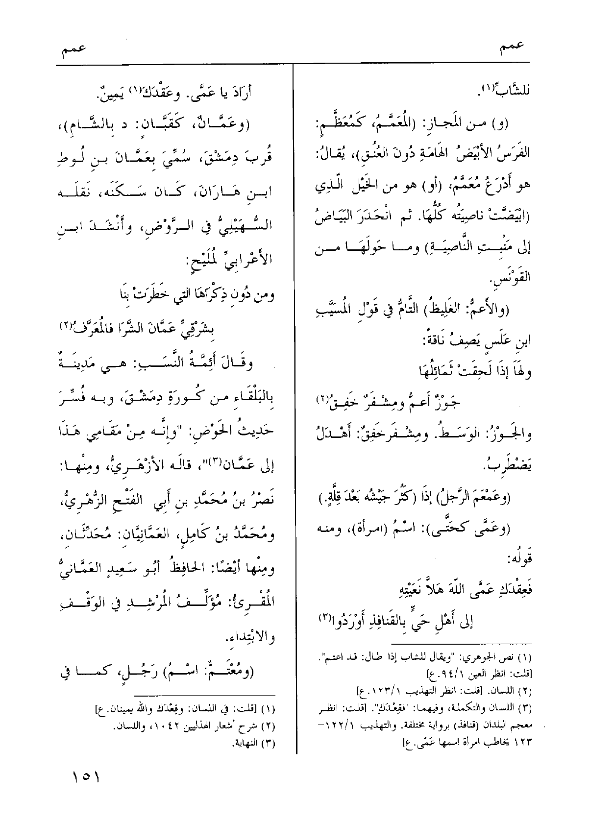 (} وعَمَّانٌ، كَقَبَّانٍ: د بِالشَّامِ) ، قُربَ دِمَشْقَ، سُمِّيَ {بِعَمَّانَ بنِ لُوطِ ابنِ هَارَانَ، كَان سَكَنَه، نَقلَه السُّهَيْلِيُّ فِي الرَّوْضِ، وأَنْشَدَ ابنِ الأَعْرابِيِّ لمُلَيْحٍ: