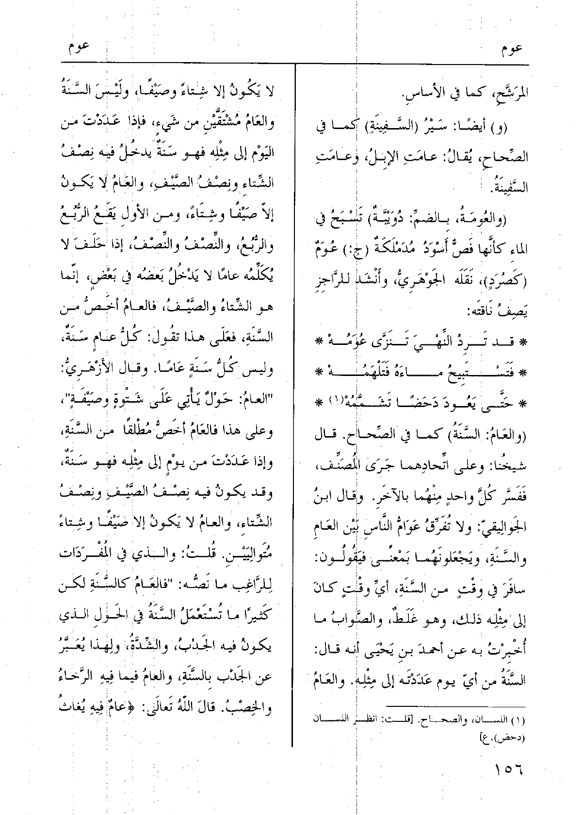 ( {والعَامُ: السَّنَةُ) كَمَا فِي الصِّحاح. قَالَ شيخُنا: وعَلى اتِّحادِهما جَرَى المُصَنِّف، فَفَسَّر كُلَّ واحدٍ مِنْهُما بالآخَرِ. وَقَالَ ابنُ الجَوالِيقيّ: وَلَا تُفَرِّقُ عَوَامُّ النَّاسِ بَيْن} العَامِ والسَّنَةِ، ويَجْعَلونَهُما بَمْعنًى فيَقُولُون: سافَرَ فِي وقْتٍ من السَّنَةِ، أيِّ وقْتٍ كانَ إِلَى مِثْلِه ذَلِك، وَهُوَ غَلَطٌ، والصَّوابُ مَا أُخْبِرْتُ بِهِ عَن أحمدَ بنِ يَحْيَى أَنه قَالَ: السَّنَةُ من أيّ يَوْم عَدَدْتَه إِلَى مِثْلِه. والعَامُ لَا يَكُونُ إِلَّا شِتاءً وصَيْفًا، ولَيْسَ السَّنَةُ والعَامُ مُشْتَقَّيْنِ من شَيءٍ، فَإِذا عَدَدْتَ من اليَوْم إِلَى مِثْلِه فَهُوَ سَنَةٌ يدخُلُ فِيهِ نِصْفُ الشِّتاءِ ونِصْفُ الصَّيْفِ، والعَامُ لَا يَكونُ إلاّ صَيْفًا وشِتَاءً، وَمن الأولِ يَقَعُ الرُّبُعُ والرُّبُعُ، والنِّصْفُ والنِّصْفُ، إِذا حَلَفَ لَا يُكَلِّمُه {عَاما لَا يَدْخُلُ بَعضُه فِي بَعْضٍ، إنّما هُوَ الشِّتاءُ والصَّيْفُ،} فالعامُ أخَصُّ من السَّنَةِ، فعَلَى هَذَا تقُول: كُلُّ عامٍ سَنَةٌ، وَلَيْسَ كُلُّ سَنَةٍ عَامًا. وَقَالَ الأزْهَرِيُّ: " العامُ: حَوْلٌ يَأْتِي عَلَى شَتْوةٍ وصَيْفَةٍ، وعَلى هَذَا فالعَامُ أخَصُّ مُطْلقًا من السَّنَةِ، وَإِذا عَدَدْتَ من يوْمٍ إِلَى مِثِلْه فَهُوَ سَنَةٌ، وَقد يكونُ فِيهِ نِصْفُ الصَّيْفِ ونِصْفُ الشِّتاءِ، والعامُ لَا يَكونُ إِلَّا صَيْفًا وشِتاءً مُتَوالِيَيْنِ. قُلتُ: وَالَّذِي فِي المُفْرَدَات لِلرَّاغِب مَا نَصُّه: " فالعَامُ كالسَّنَةِ لَكِن كَثيرًا مَا تُسْتَعْمَلُ السَّنَةُ فِي الحَولِ الَّذِي يكونُ فِيهِ الجَدْبُ، والشِّدَّةُ، ولِهذا يُعَبَّرُ عَن الجَدْب بِالسَّنَةِ، والعامُ فِيمَا فِيهِ الرَّخاءُ والخِصْبُ. قالَ اللهُ تَعالَى: (! عامٌ فِيهِ يُغاثُ