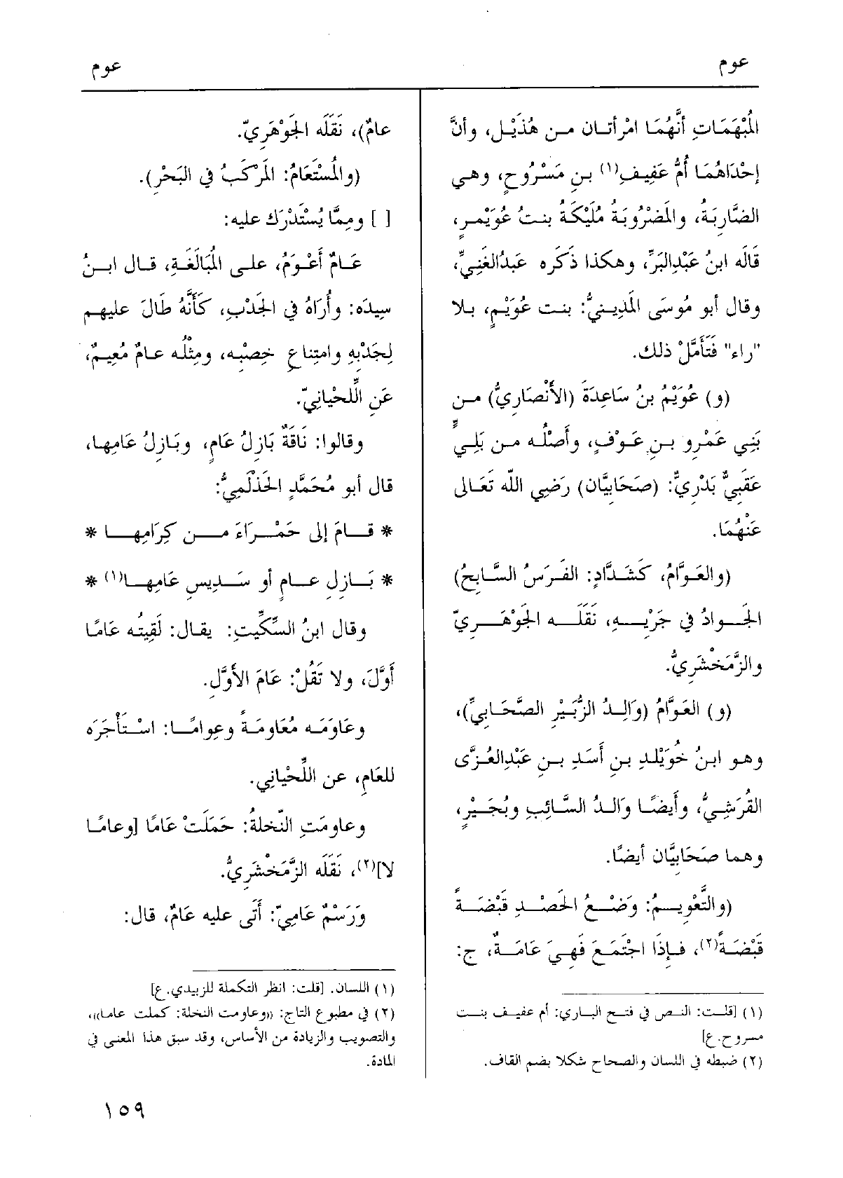 (و) عُوَيْمُ بنُ سَاعِدَةَ (الأَنْصَارِيُّ) من بَنِي عَمْرِو بنِ عَوْفٍ، وأَصْلُه من بَلِيٍّ عَقَبِيٌّ بَدْرِيٌّ: (صحابيَّان) رَضِي الله تَعَالَى عَنْهُمَا. (والعَوَّامُ، كشدَّادٍ: الفَرَسُ السَّابِحُ) الجَوادُ فِي جَرْيِهِ، نَقَلَه الجَوْهَرِيّ والزَّمَخْشَرِيُّ.
