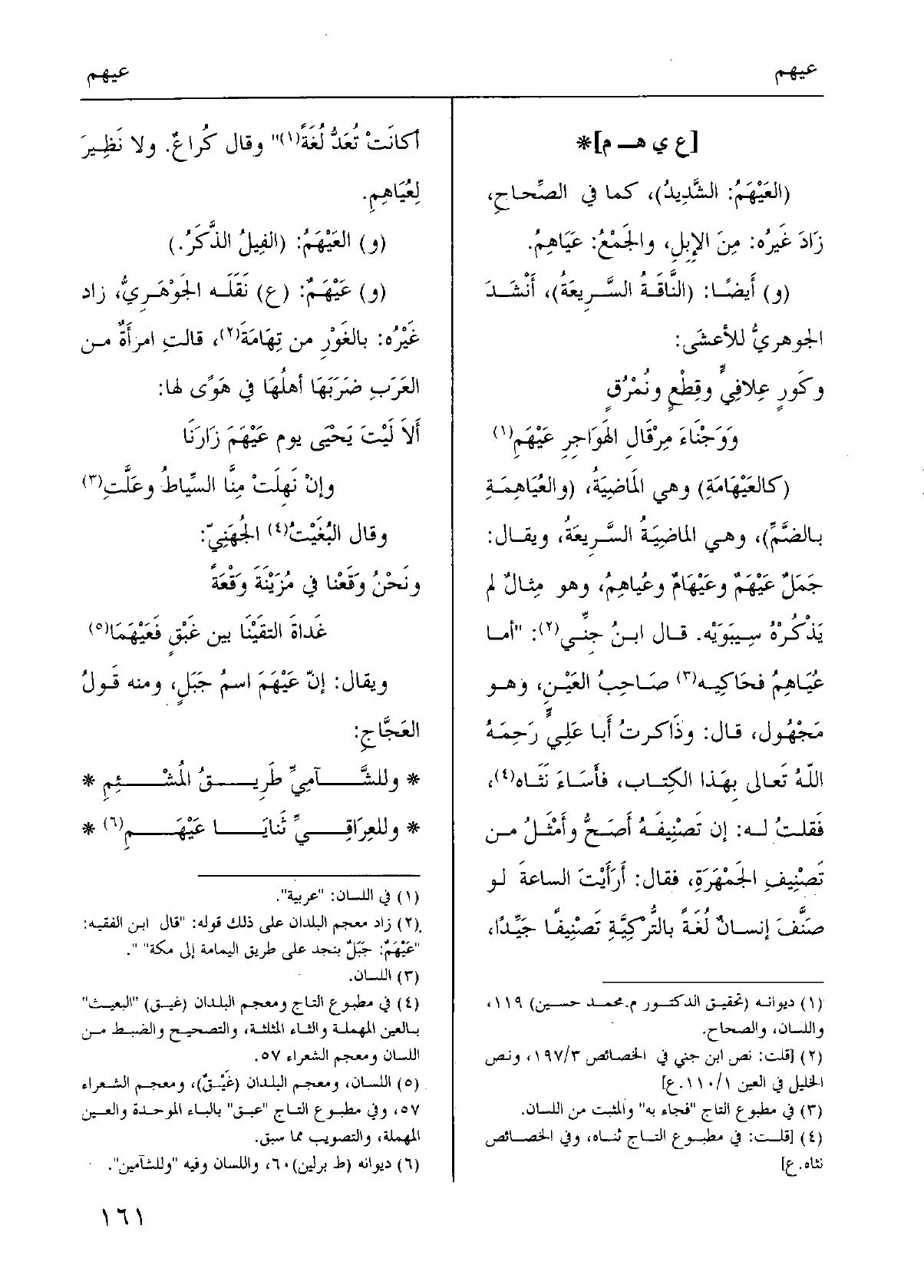 (} كالعَيْهَامَةِ) وَهِي المَاضِيَةُ، ( {والعُيَاهِمَةِ بالضَّمِّ) ، وَهِي الماضِيَةُ السَّرِيعَةُ، وَيُقَال: جَمَلٌ عَيْهَمٌ} وعَيْهَامٌ {وعُياهِمُ، وَهُوَ مِثالٌ لم يَذْكُرْهُ سِيبَوَيْه. قَالَ ابنُ جِنِّي: " أما} عُيَاهِمُ فحَاكِيه صَاحِبُ العَيْنِ، وَهُوَ مَجْهُول، قَالَ: وذَاكرتُ أَبا عَلِيٍّ رَحِمَهُ اللهُ تَعالى بِهَذا الكِتاب، فأَسَاءَ نَثَاه، فَقلتُ لَهُ: إِن تَصْنِيفَهُ أَصَحُّ وأَمْثَلُ من تَصْنِيفِ الجَمْهَرَةِ، فَقَالَ: أَرَأَيْتَ الساعةَ لَو صَنَّفَ إنسانٌ لُغَةً بالتُّرْكِيَّةِ تَصْنِيفًا جَيِّدًا، أكانَتْ تُعَدُّ لُغَةً " وَقَالَ كُراعٌ. وَلَا نَظِيرَ لِعُيَاهِمِ.