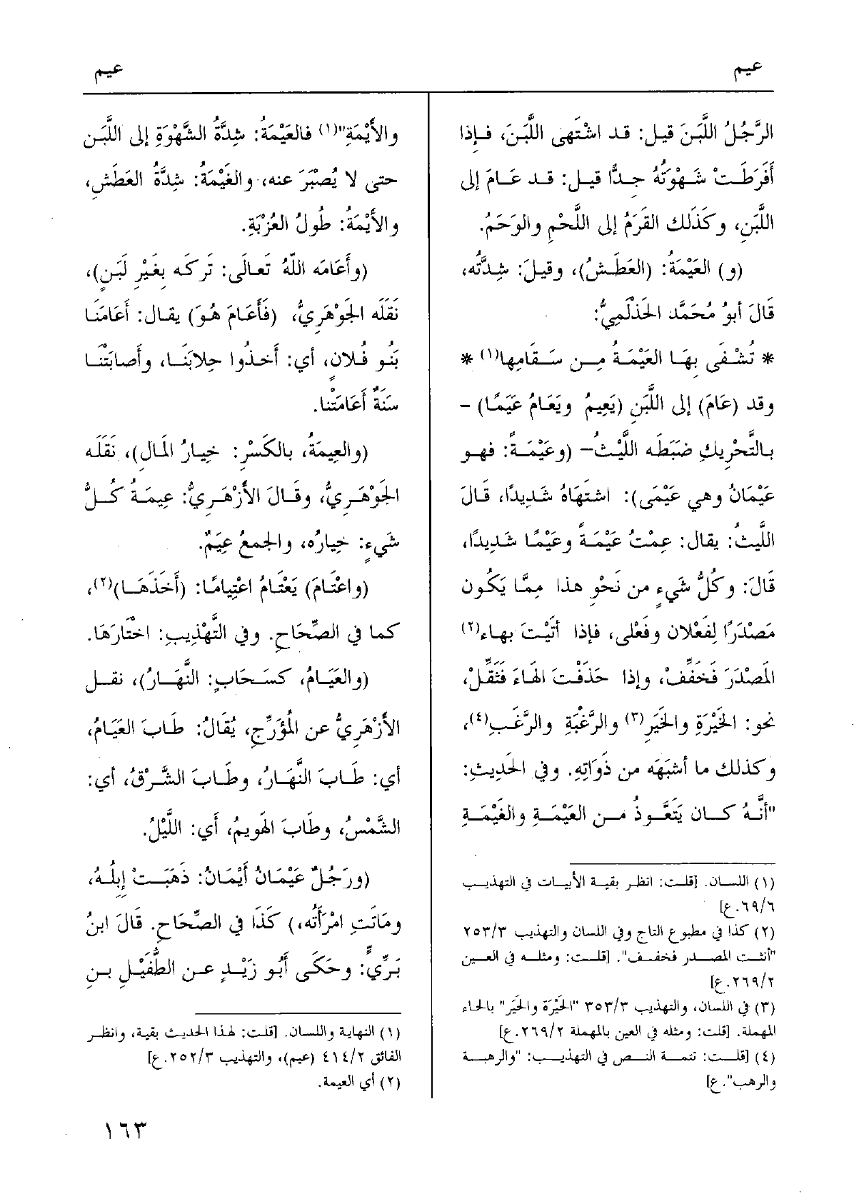 وَقد ( {عَامَ) إِلَى اللَّبَنِ (} يَعِيمُ {ويَعَامُ} عَيَمًا) - بالتَّحْرِيكِ ضَبَطَه اللَّيْثُ - ( {وعَيْمَةً: فَهُوَ} عَيْمَانُ وَهِي {عَيْمَى) : اشتَهَاهُ شَدِيدًا، قَالَ اللَّيثُ: يُقَال:} عِمْتُ {عَيْمَةً} وعَيْمًا شَديدًا، قَالَ: وكُلُّ شَيءٍ من نَحْوِ هَذَا مِمَّا يَكُون مَصْدَرًا لِفَعْلان وفَعْلى، فَإِذا أتَيْتَ بهاء المَصْدَرَ فَخَفِّفْ، وَإِذا حَذَفْتَ الهَاءَ فَثَقِّلْ، نَحْو: الخَيْرَةِ والخَيَرِ والرَّغْبَةِ والرَّغَبِ، وَكَذَلِكَ مَا أشبَهَه من ذَوَاتِهِ. وَفِي الحَدِيثِ: " أنَّهُ كَانَ يَتَعَّوذُ من {العَيْمَةِ والغَيْمَةِ والأَيْمَةِ فالعَيْمَةُ: شِدَّةُ الشَّهْوَةِ إِلَى اللَّبَن حَتَّى لَا يُصْبَرَ عَنهُ، والغَيْمَةُ: شِدَّةُ العَطَشِ، والأَيْمَةُ: طُولُ العُزْبَةِ.