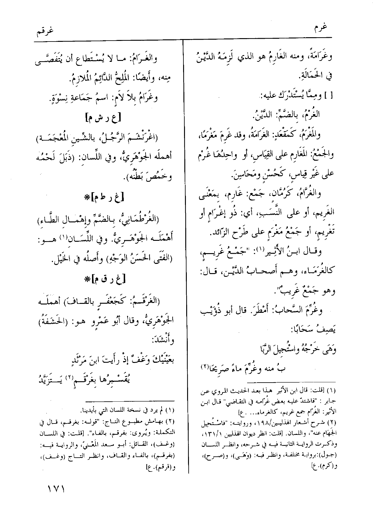 وغَرَامَةً، وَمِنْه الغَارِمُ هُوَ الَّذِي لَزِمَهُ الدَّيْنُ فِي الحَمَالَةِ. [] ومِمَّا يُسْتَدْرَك عَلَيْهِ: