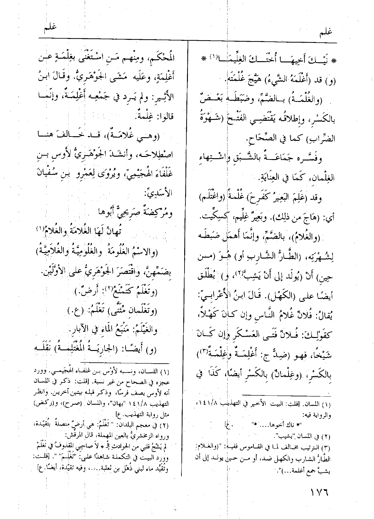 (وَهِي غُلامَةٌ) ، قد خَالفَ هُنَا اصْطِلاحَه، وأنشَدَ الجَوْهَرِيُّ لأَوسِ بنِ غَلْفَاءَ الهُجَيْمِيّ، ويُرْوَى لِعَمْرِو بنِ سُفْيانَ الأسَدِيِّ: