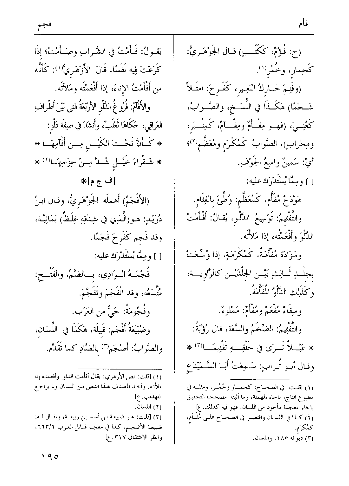 (} وفَئِمَ حَارِكُ البَعِِيرِ، كَفَرِحَ: امتَلاَ شَحْمًا) هَكَذَا فِي النُّسَخِ، والصَّوابُ، كَعُنِيَ، (فَهُوَ {مِفْأَمٌ} ومِفْآمٌ، كَمِنْبَرٍ، ومِحْرابٍ) ، الصَّوابُ كَمُكْرَمٍ ومُعَظَّمٍ؛ أيْ: سَمينٌ واسِعُ الجَوْفِ. [] ومِمَّا يُسْتَدرَك عَلَيْهِ: