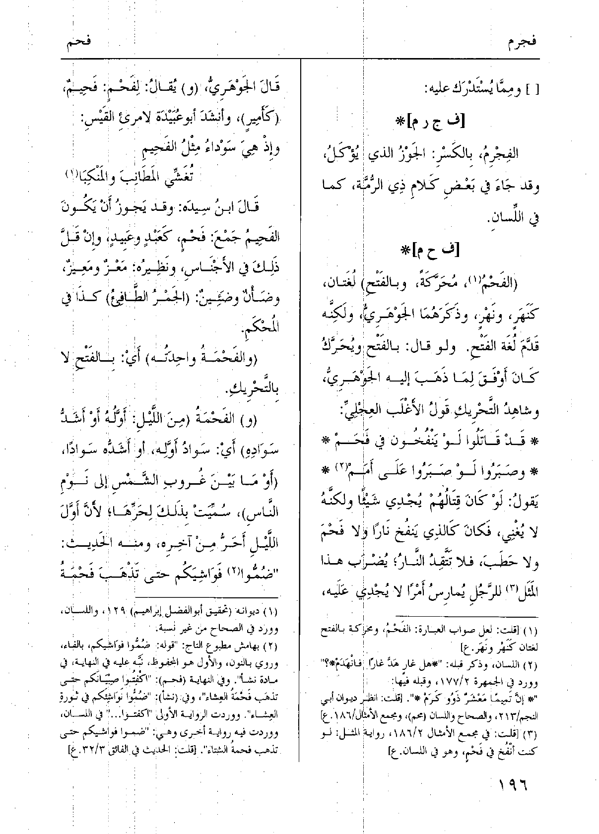 (الفَحْمُ، مُحَرَّكَةً، وبالفَتْحِ) لُغَتان، كَنَهرٍ، ونَهْرٍ، وذَكَرَهُمَا الجَوْهَرِيُّ، ولَكِنَّه قَدَّمَ لُغَة الفَتْحِ. وَلَو قَالَ: بالفَتْح ويُحَرَّكُ كَانَ أَوْفَقَ لِمَا ذَهَبَ إِلَيْهِ الجَوْهَرِيُّ، وشاهِدُ التَّحْرِيكِ قَولُ الأَغْلَب العِجْلِيِّ: