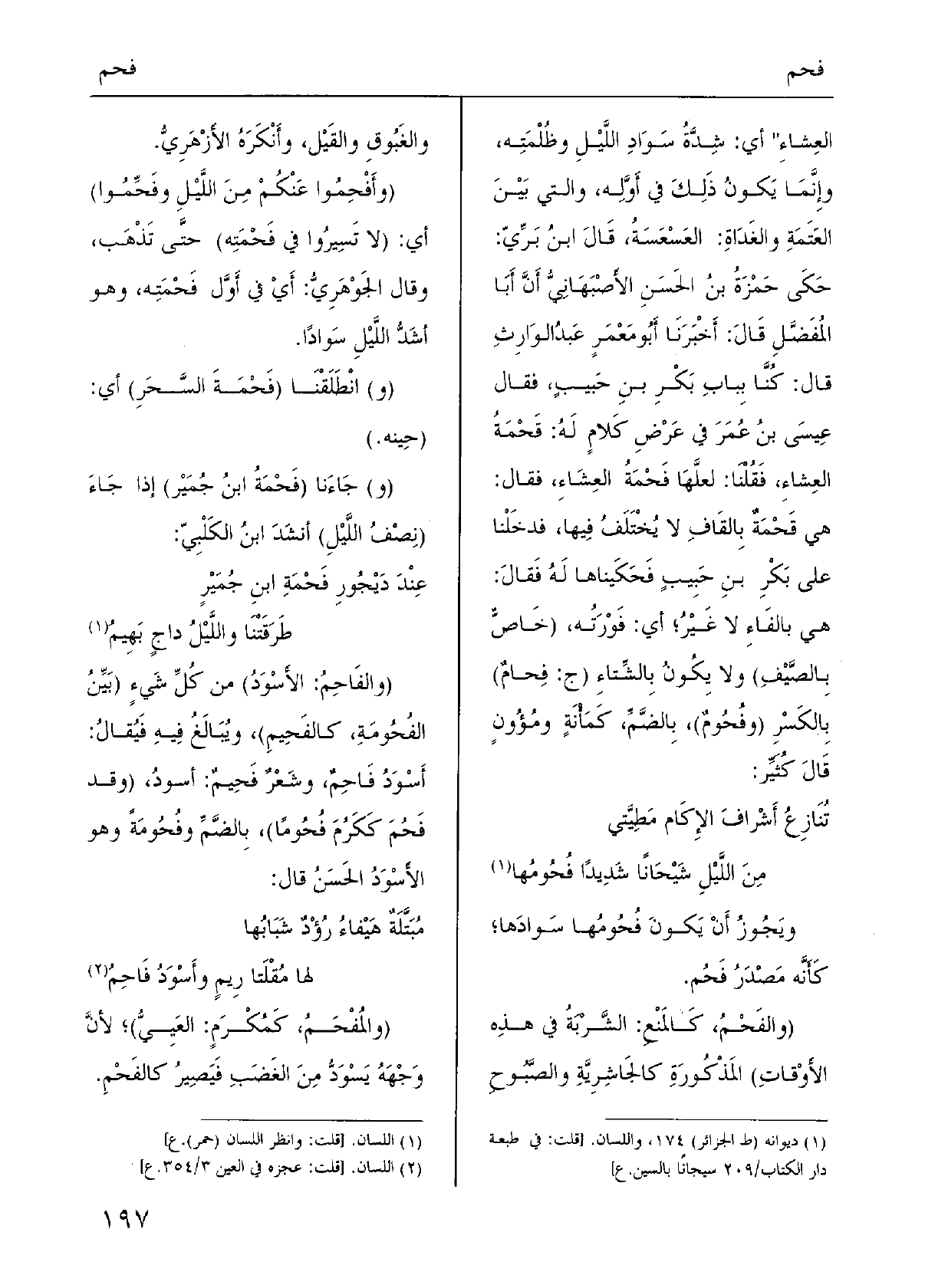العِشاءِ " أَي: شِدَّةُ سَوَادِ اللَّيْلِ وظُلْمَتِه، وإِنَّمَا يَكونُ ذَلِكَ فِي أَوَّلِه، وَالَّتِي بَيْنَ العَتَمَةِ والغَدَاةِ: العَسْعَسَةُ، قَالَ ابنُ بَرِّيّ: حَكَى حَمْزَةُ بنُ الحَسَنِ الأَصْبَهَانِيُّ أَنَّ أَبَا المُفَضَّلِ قَالَ: أَخْبَرَنَا أَبُو مَعْمَرٍ عَبدُ الوَارِثِ قَالَ: كُنَّا بِبابِ بَكْرِ بنِ حَبيبٍ، فَقَالَ عِيسَى بنُ عُمَرَ فِي عَرْضِ كَلامٍ لَهُ: قَحْمَةُ العِشاءِ، فَقُلْنَا: لعلَّهَا فَحْمَةُ العِشَاءِ، فَقَالَ: هِيَ قَحْمَةٌ بِالقَافِ لَا يُخْتَلَفُ فِيها، فدخَلْنا على بَكْرِ بنِ حَبِيبٍ فَحَكَيناها لَهُ فَقالَ: هِيَ بالفَاءِ لَا غَيْرُ؛ أَي: فَوْرَتُه، (خَاصٌّ بِالصَّيْفِ) وَلَا يَكُونُ بِالشِّتاءِ (ج: فِحامٌ) بِالكَسْرِ (وفُحُومٌ) ، بِالضَّمِّ، كَمَأْنَةٍ ومُؤُونٍ قَالَ كُثَيِّر:
