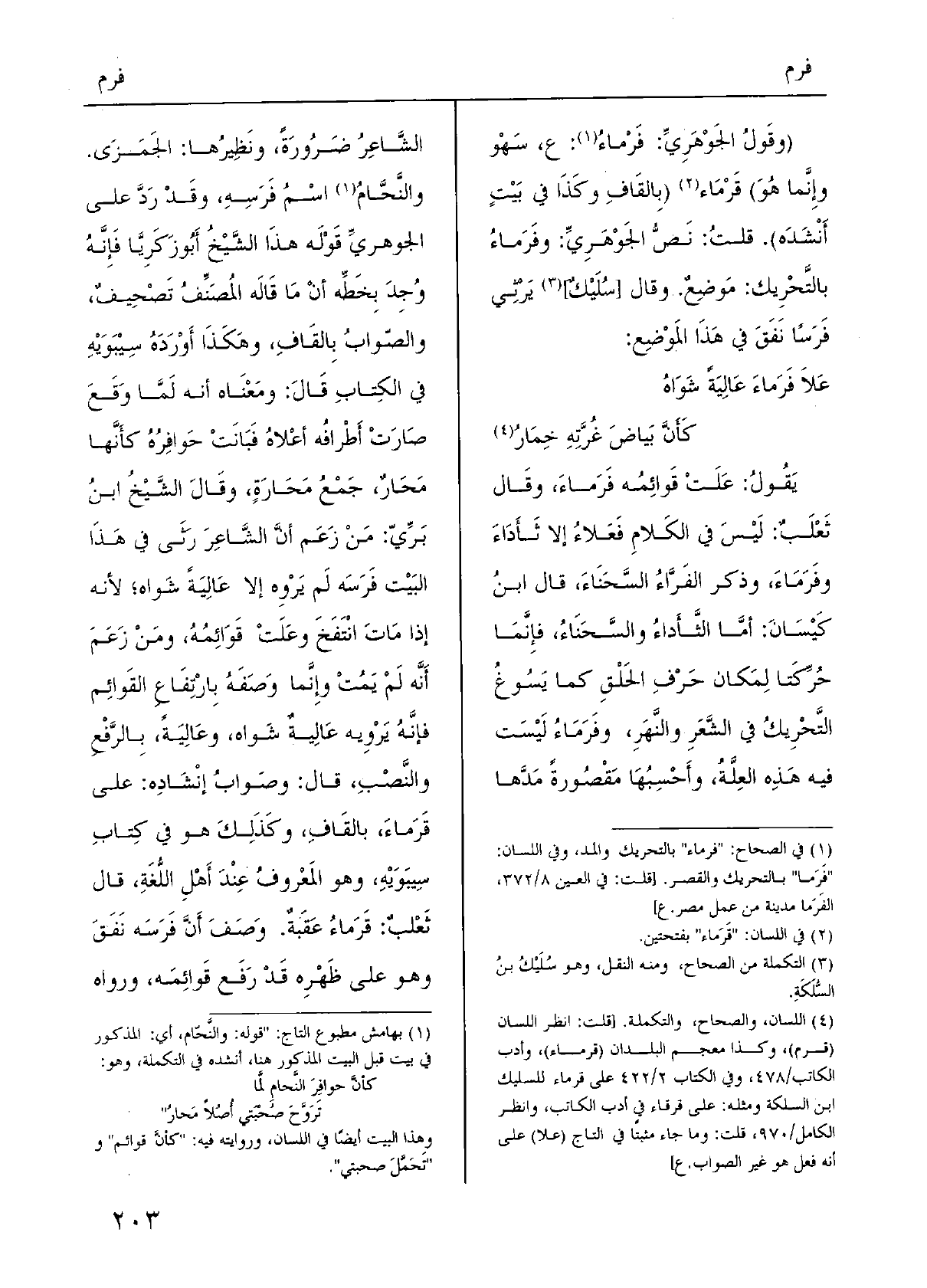 يَقُولُ: عَلَتْ قَوائِمُه فَرَماءَ، وقَال ثَعْلَبٌ: لَيْسَ فِي الكَلامِ فَعَلاءُ إِلَّا ثَأَدَاءَ وفَرَمَاءَ، وَذكر الفَرَّاءُ السَّحَنَاءَ، قَالَ ابنُ كَيْسَانَ: أَمَّا الثَّأَداءُ والسَّحَنَاءُ، فإِنَّما حُرِّكَتا لِمَكان حَرْفِ الحَلْقِ كَمَا يَسُوغُ التَّحْرِيكُ فِي الشَّعَرِ والنَّهَرِ، وفَرَمَاءُ لَيْسَت فِيهِ هَذِه العِلَّةُ، وأَحْسِبُهَا مَقْصُورةً مَدَّها الشَّاعِرُ ضَرُورَةً، ونَظِيرُها: الجَمَزَى. والنَّحَّامُ اسْمُ فَرَسِهِ، وقَدْ رَدَّ على الجوهريِّ قَوْلَه هذَا الشَّيْخُ أَبُو زَكَرِيَّا فَإِنِّهُ وُجِدَ بِخَطِّه أنْ مَا قَالَه المُصَنِّفُ تَصْحِيفٌ، والصّوابُ بِالقَافِ، وهَكَذَا أَوْرَدَهُ سِيْبَوَيْهِ فِي الكِتابِ قَالَ: ومَعْنَاه أَنه لَمَّا وَقَعَ صَارَتْ أَطْرافُه أعْلاهُ فَبَانَتْ حَوافِرُهُ كأَنَّها مَحَارٌ، جَمْعُ مَحَارَةٍ، وقَالَ الشَّيْخُ ابنُ بَرِّيّ: مَنْ زَعَم أنَّ الشَّاعِرَ رَثَى فِي هَذَا البَيْت فَرَسَه لَم يَرْوِه إِلَّا عَالِيَةً شَواه؛ لِأَنَّهُ إِذا مَاتَ انْتَفَخَ وعَلَتْ قَوَائِمُهُ، ومَنْ زَعَمَ أَنَّهُ لَمْ يَمُتْ وإنَّما وَصَفَهُ بارْتِفاعِ القَوائِم فإنَّه يَرْوِيه عَالِيةٌ شَواه، وعَالِيَةً، بِالرَّفْعِ والنَّصْبِ، قَالَ: وصَوابُ إنْشَادِه: على قَرْمَاءَ، بالقَافِ، وكَذَلِكَ هُوَ فِي كِتابِ سِيبَوَيْهِ، وَهُوَ المَعْرِوفُ عِنْدَ أَهْلِ اللُّغَةِ، قَالَ ثَعْلَبٌ: قَرَماءُ عَقَبةٌ. وَصَفَ أَنَّ فَرَسَه نَفَقَ وَهُوَ على ظَهْرِه قَدْ رَفَع قَوائِمَه، وَرَوَاهُ