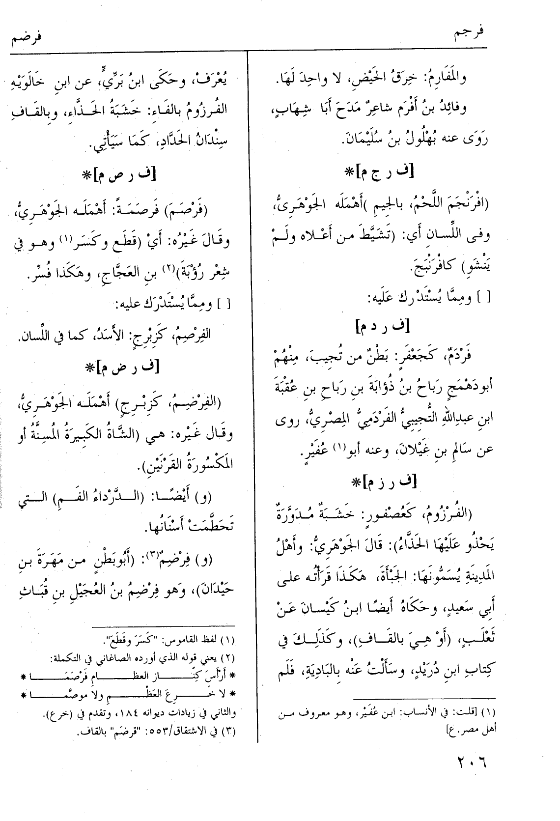 (فَرْصَمَ) فَرصَمَةً: أَهْمَلَه الجَوْهَرِيُّ، وقَالَ غَيْرُه: أَيْ (قَطَع وكَسَر وَهُوَ فِي شِعْر رُؤْبَةَ) بنِ العَجَّاجِ، وهَكَذا فُسِّر. [] ومِمَّا يُسْتَدْرَك عَلَيْهِ: