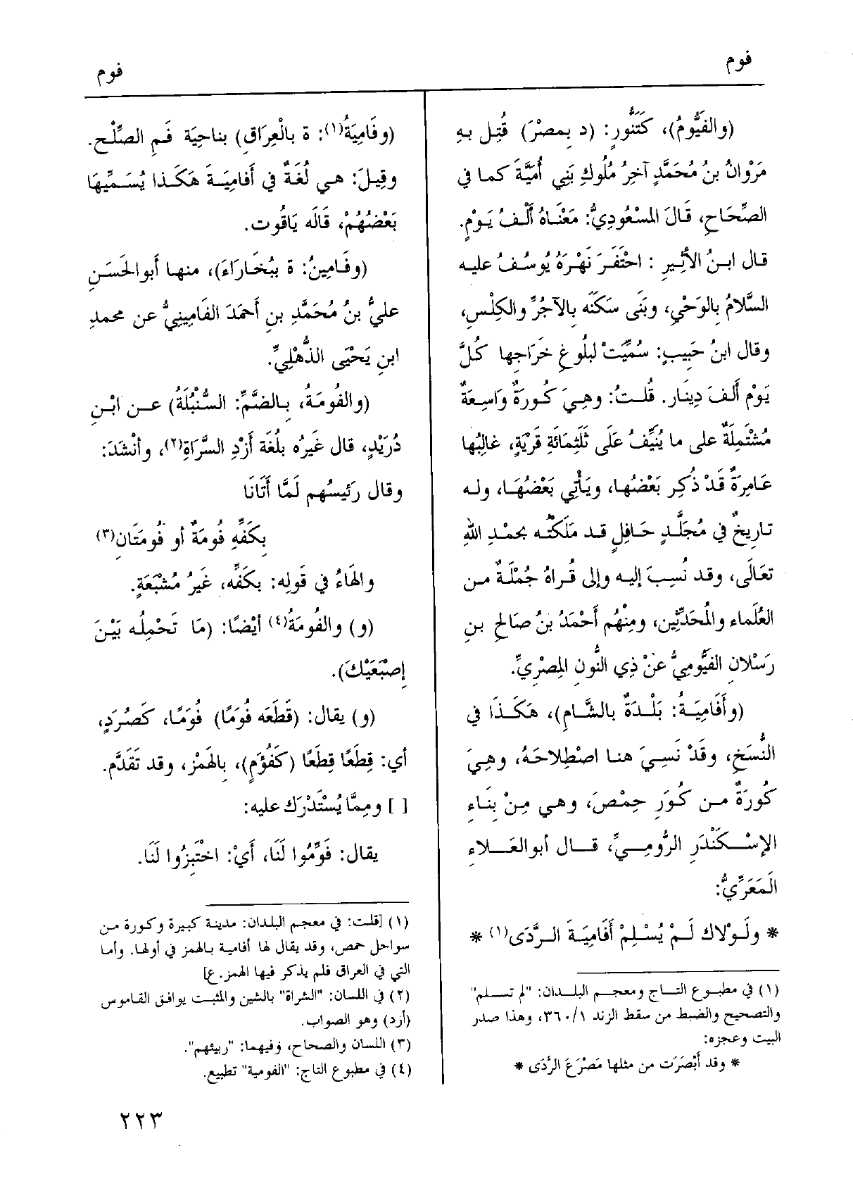 ( {وأَفَامِيَةُ: بَلْدَةٌ بالشَّامِ) ، هَكَذَا فِي النُّسَخِ، وقَدْ نَسِيَ هُنَا اصْطِلاحَهُ، وهِيَ كُورَةٌ من كُوَرِ حِمْصَ، وَهِي مِنْ بِنَاءِ الإسْكَنْدَرِ الرُّومِيِّ، قَالَ أَبُو العَلاءِ الَمَعَرِّيُّ: