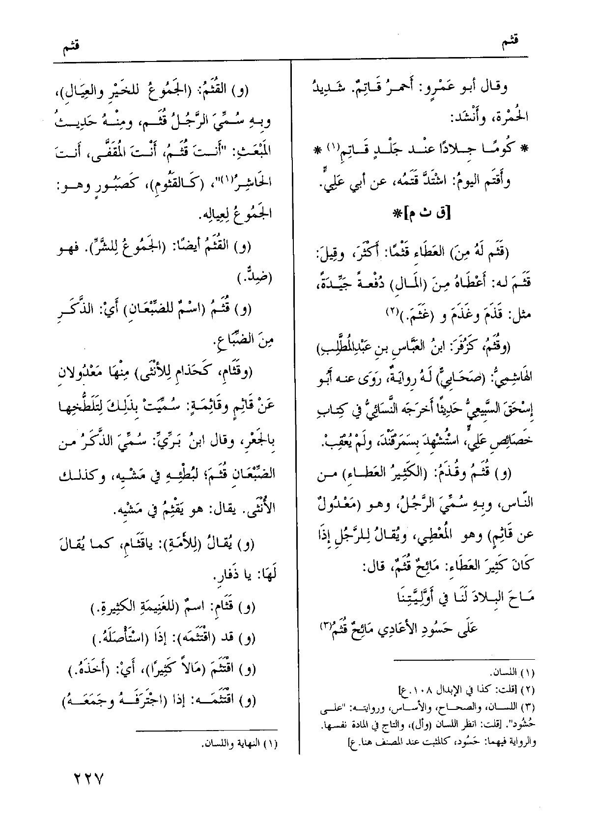(قَثَم لَهُ مِنَ) العَطَاءِ قَثْمًا: أَكْثَرَ، وقِيلَ: قَثَمَ لَهُ: أَعْطَاهُ مِنَ (المَالِ) دُفْعةً جَيِّدَةً، مثل: قَذَمَ وغَذَمَ و (غَثَمَ) .