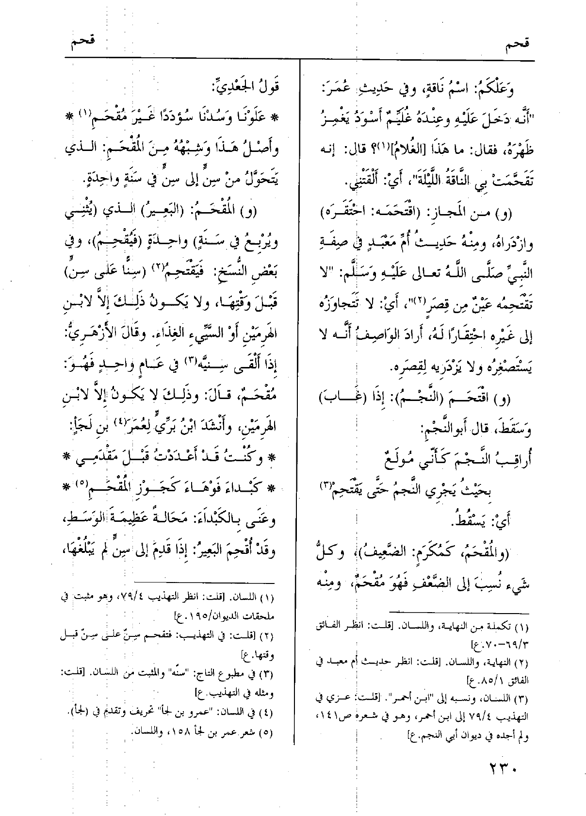 (و) المُقْحَمُ: (البَعِيرُ) الَّذِي (يُثْنِي ويُرْبِعُ فِي سَنَةٍ) واحِدَةٍ (فَيُقْحِمُ) ، وَفِي بَعْضِ النُّسَخِ: فَيَقْتَحِمُ (سِنًّا عَلى سِنٍّ) قَبْلَ وَقْتِهَا، وَلَا يَكونُ ذَلِكَ إِلاَّ لابْنِ الهَرِمَيْنِ اَوْ السَّيِّيءِ الغِذَاءِ. وقَالَ الأَزْهَرِيُّ: إِذَا أَلْقَى سِنيَّه فِي عَامٍ واحِدٍ فَهُوَ: مُقْحَمٌ، قَالَ: وذَلِكَ لَا يَكونُ إِلاَّ لابْنِ الهَرِمَيْنِ، وأَنْشَدَ ابْنُ بَرِّيٍّ لِعُمَرَ بنِ لَجَأٍ: