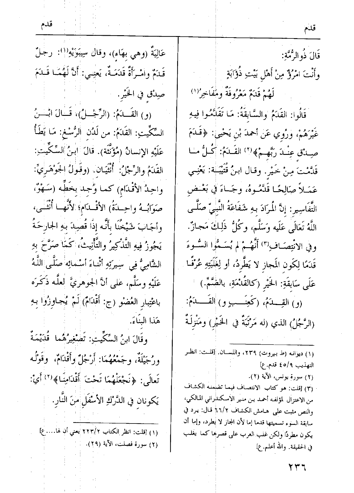 قَالُوا: القَدَمُ والسَّابِقَةُ: مَا تَقَدَّمُوا فِيهِ غَيْرهُمْ، ورُوِي عَن أحمدَ بْنِ يَحْيى: {قدم صدق عِنْد رَبهم} القَدَمُ: كُلُّ مَا قَدَّمْتَ مِنْ خَيْرٍ. وَقَالَ ابنُ قُتَيْبَة: يَعْنِي عَمَلاً صَالِحًا قَدَّمُوهُ، وجَاءَ فِي بَعْضِ التَّفَاسِيرِ: إِنَّ المُرَادَ بِهِ شَفَاعَةُ النَّبِيّ صَلَّى اللَّهُ تَعَالَى عَلَيه وَسَلَّم، وكُلُّ ذَلِكَ مَجازٌ. وَفِي الانْتِصَافِ أَنَّهُمْ لم يُسَمُّوا السُّوءَ قَدَمًا لِكَونِ المَجازِ لَا يَطَّرِدُ، أَو لِغَلَبَتِهِ عُرْفًا عَلَى سَابِقَةِ: الخَيْرِ (كالقُدْمَةِ، بالضَّمِّ) .