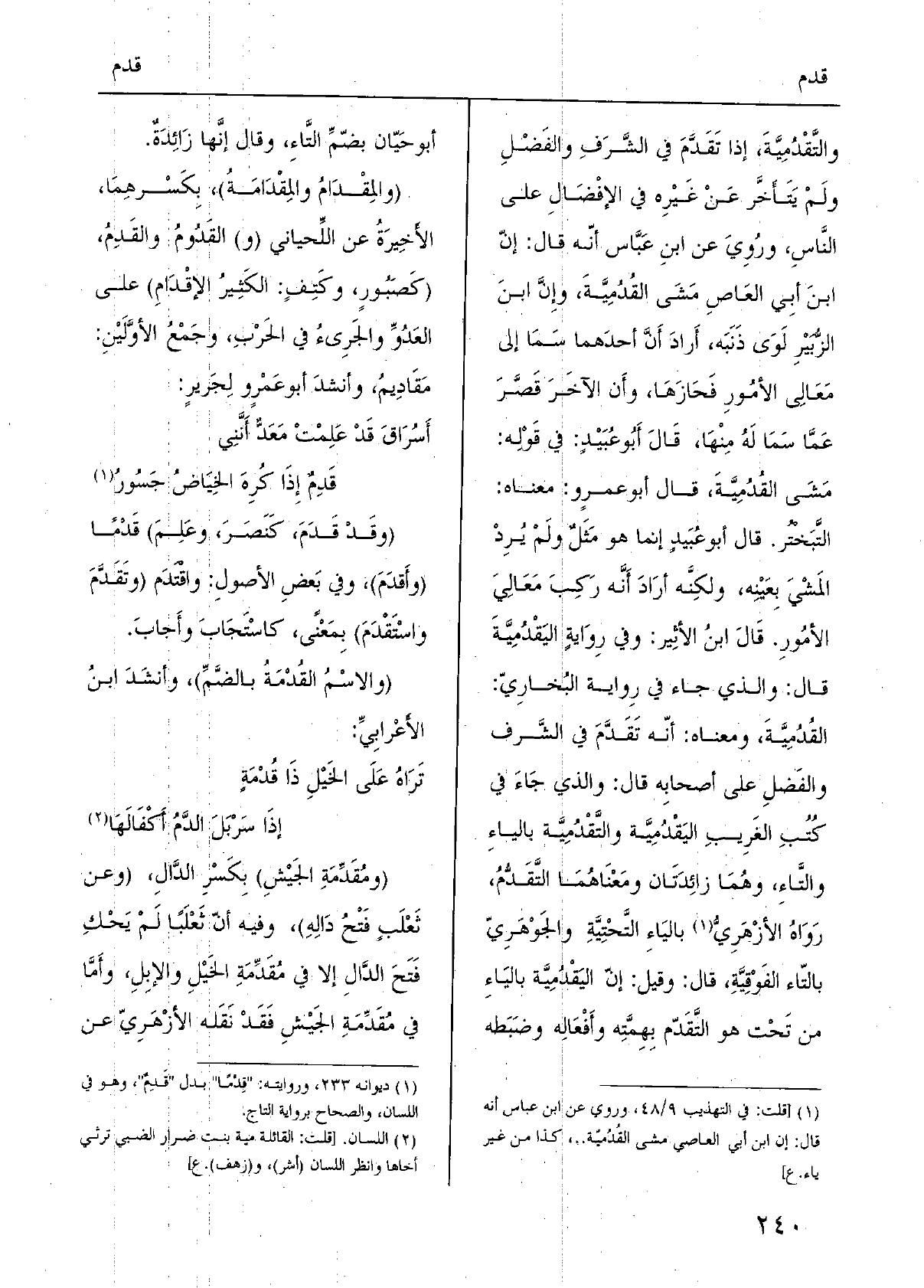 والتَّقْدُمِيَّةَ، إِذا تَقَدَّمَ فِي الشَّرَفِ والفَضْلِ ولَمْ يَتَأَخَّر عَنْ غَيْرِه فِي الإفْضَالِ على النَّاسِ، ورُوِيَ عَن ابنِ عَبَّاس أنّه قَالَ: إنّ ابنَ أبِي العَاصِ مَشَى القُدُمِيَّةَ، وإِنَّ ابنَ الزُّبَيْرِ لَوَى ذَنَبَه، أَرادَ أَنَّ أحدَهما سَمَا إِلَى مَعَالِى الأمُورِ فَحَازَهَا، وأَن الآخَرَ قَصَّرَ عَمَّا سَمَا لَهُ مِنْهَا، قَالَ أَبُو عُبَيْدٍ: فِي قَوْلِه: مَشَى القُدُمِيَّةَ، قَالَ أَبُو عمرٍ و: مَعْنَاهُ: التَّبَخْتُر. قَالَ أَبُو عُبَيدٍ إِنَّمَا هُوَ مَثَلٌ ولَمْ يُرِدْ المَشْيَ بِعَيْنِه، ولكِنَّه أرَادَ أَنَّه رَكِبَ مَعَالِيَ الأمُورِ. قَالَ ابنُ الأثِير: وَفِي رِوَايةٍ اليَقْدُمِيَّةَ قَالَ: وَالَّذِي جَاءَ فِي رِواية البُخارِيّ: القُدُمِيَّةَ، وَمَعْنَاهُ: أنّه تَقَدَّمَ فِي الشَّرف والفَضلِ على أصحابِه قَالَ: وَالَّذِي جَاءَ فِي كُتُبِ الغَرِيبِ اليَقْدُمِيَّة والتَّقْدُمِيَّة بالياءِ والتَّاءِ، وهُمَا زائِدَتَان ومَعْنَاهُمَا التَّقَدُّمُ، رَوَاهُ الأزْهَرِيُّ باليّاءِ التَّحْتِيَّةِ والجَوْهَرِيّ بالتّاء الفَوْقِيَّةِ، قَالَ: وَقيل: إنّ اليَقْدُمِيَّة باليَاءِ من تَحْت هُوَ التَّقَدّم بِهِمَّتِه وأَفْعَالِه وضَبَطه أَبُو حَيّان بضّمِّ التَّاءِ، وَقَالَ إنَّها زَائِدَةٌ. \ (والمِقْدَامُ والمِقْدَامَةُ) ، بِكَسْرهِمَا، الأَخِيرَةُ عَن اللِّحياني (و) القَدُومُ والقَدِمُ، (كَصَبُورٍ، وكَتِفٍ: الكَثِيرُ الإقْدَامِ) على العَدُوِّ والجَرِىءُ فِي الحَرْبِ، وجَمْعُ الأوَّلَيْنِ: مَقَادِيمُ، وأنشدَ أَبُو عَمْرٍ ولِجَريرٍ: