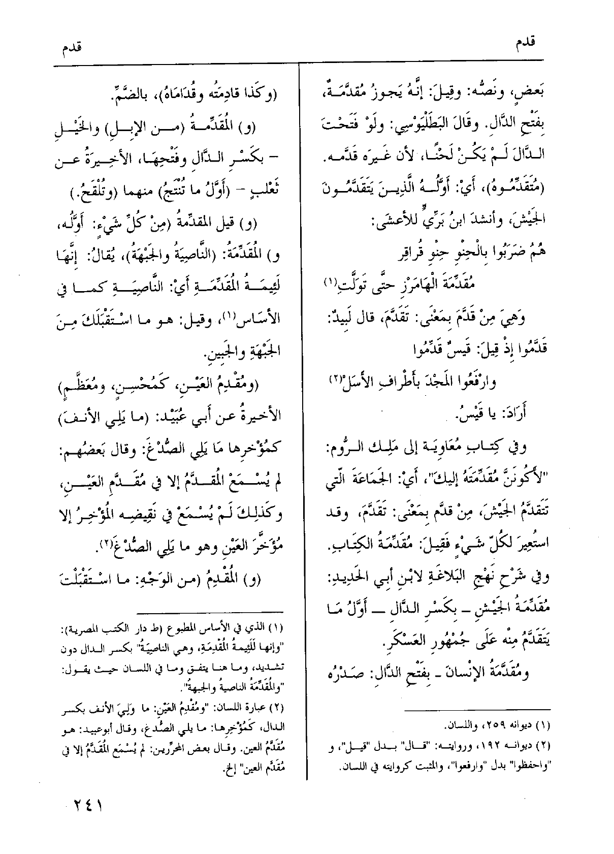 وَهِيَ مِنْ قَدَّمَ بِمَعْنَى: تَقَدَّم، قَالَ لَبِيدٌ: