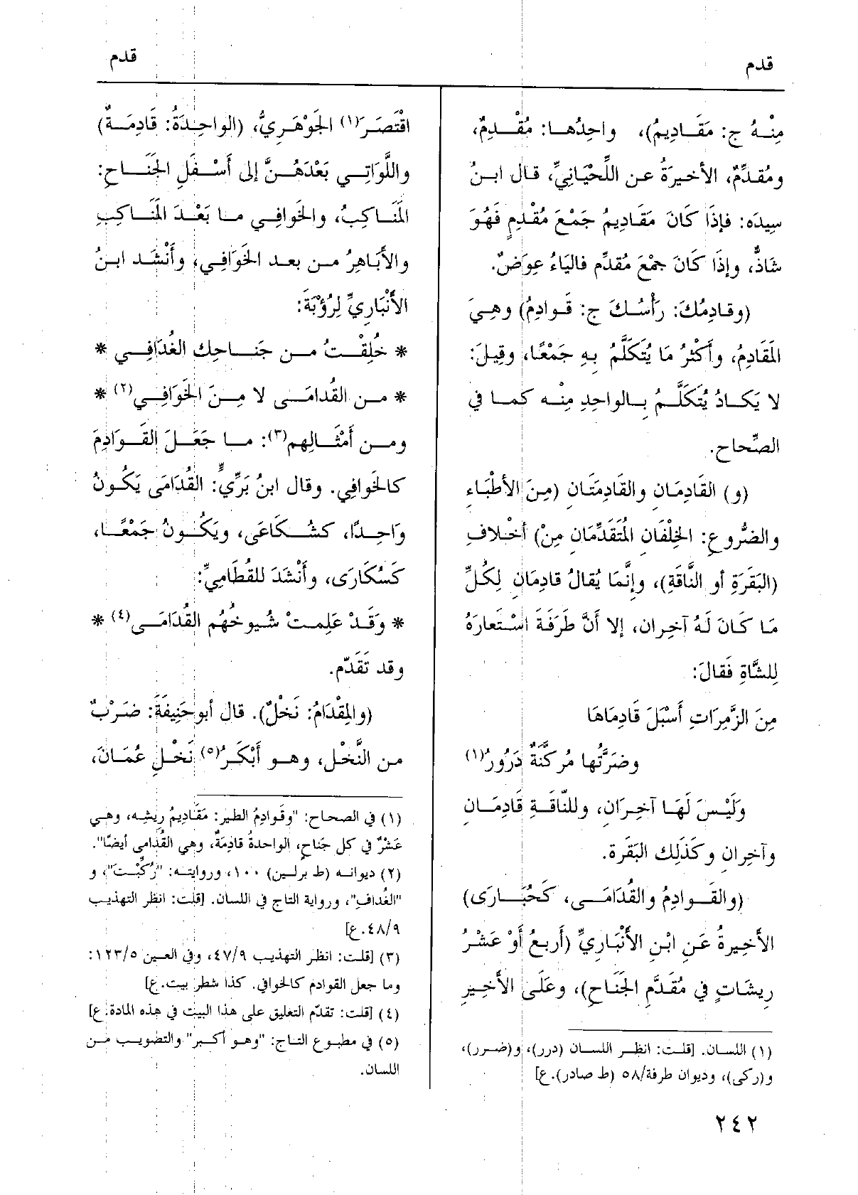 (والقَوادِمُ والقُدَامَى، كَحُبَارَى) الأَخِيرةُ عَنِ ابْنِ الأَنْبَارِيِّ (أَربعُ أَوْ عَشْرُ رِيشَاتٍ فِي مُقَدَّمِ الجَنَاحِ) ، وعَلَى الأَخِيرِ اقْتَصَرَ الجَوْهَرِيُّ، (الواحِدَةُ: قَادِمَةٌ) واللَّوَاتِي بَعْدَهُنَّ إِلَى أَسْفَلِ الجَنَاحِ: المَنَاكِبُ، والخَوافِي مَا بَعْدَ المَنَاكِبِ والأَبَاهِرُ من بعد الخَوَافِي، وأَنْشَد ابنُ الأَنْبَارِيِّ لِرُؤْبَةَ: