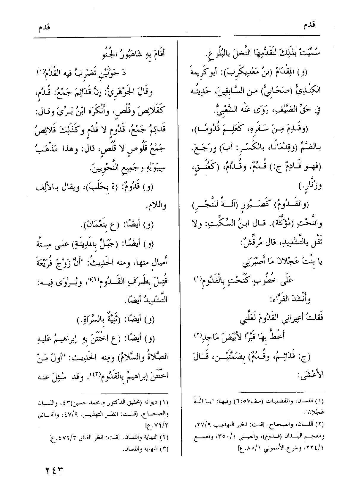 وقَالَ الجَوْهَرِيُّ: إنَّ قَدَائِمَ جَمْعُ: قُدُمٍ، كَقَلائِصَ وقُلُصٍ، وأَنْكَرَه ابْنُ بَرِّيّ وَقَالَ: قَدائِمُ جَمْعُ، قَدُومٍ لَا قُدُمٍ وكَذَلِكَ قَلائِصُ جَمْعُ قَلُوصٍ لَا قُلُصٍ، قَالَ: وَهَذَا مَذْهَبُ سِيبَوَيْهِ وجَمِيعِ النَّحْوِيينَ.