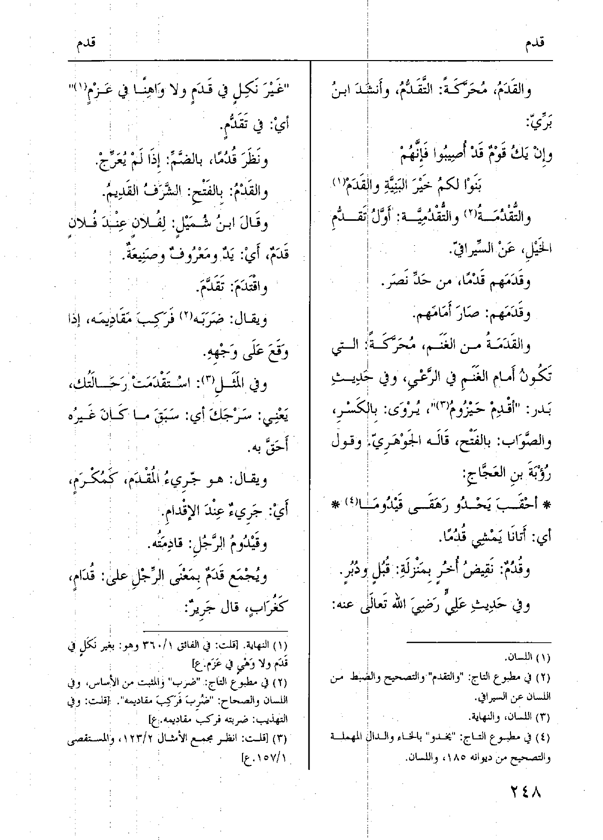 ويُجْمَع قَدَمٌ بِمَعْنَى الرَّجْلِ على " قُدَامٍ، كَغُرَابٍ، قَالَ جَرِيرٌ: