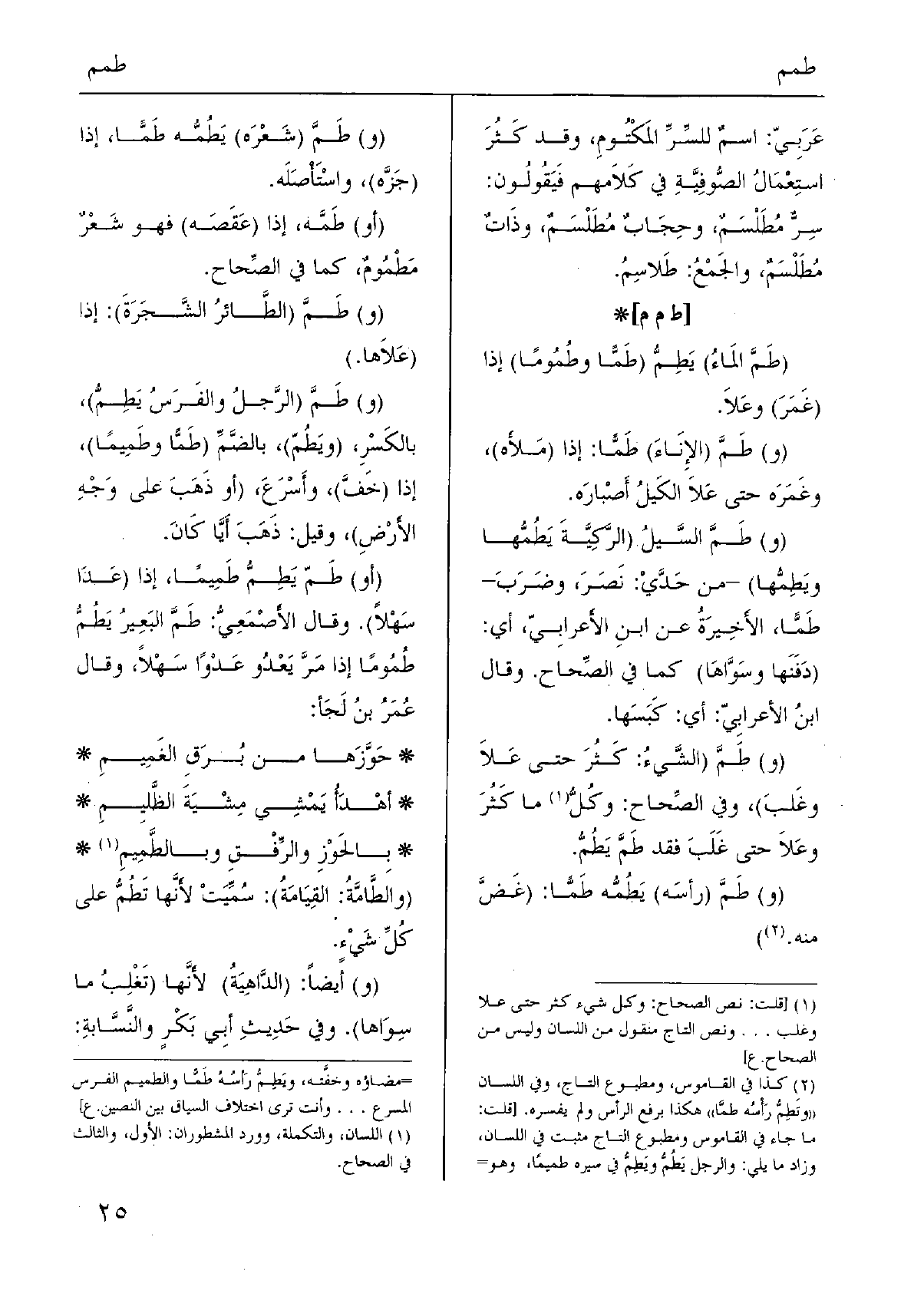 (و) طَمَّ السَّيلُ (الرَّكِيَّةَ {يَطُمُّها} ويَطِمُّها) - من حَدَّىْ: نَصَرَ، وضَرَبَ - طَمًّا، الأَخِيرَةُ عَن ابنِ الأَعرابِيّ، أَي: (دَفَنَها وسَوَّاها) كَمَا فِي الصِّحاح. وَقَالَ ابنُ الأعرابِيّ: أَي: كَبَسَها.