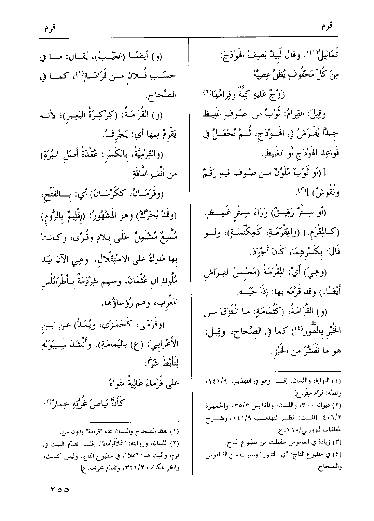 وقِيلَ: القِرامُ: ثَوْبٌ من صُوفٍ غَلِيظ جِدًّا يُفْرَشُ فِي الهَوْدَجِ، ثُمَّ يُجْعَلُ فِي قَواعِد الهَوْدَجِ أَو الغَبيطِ.