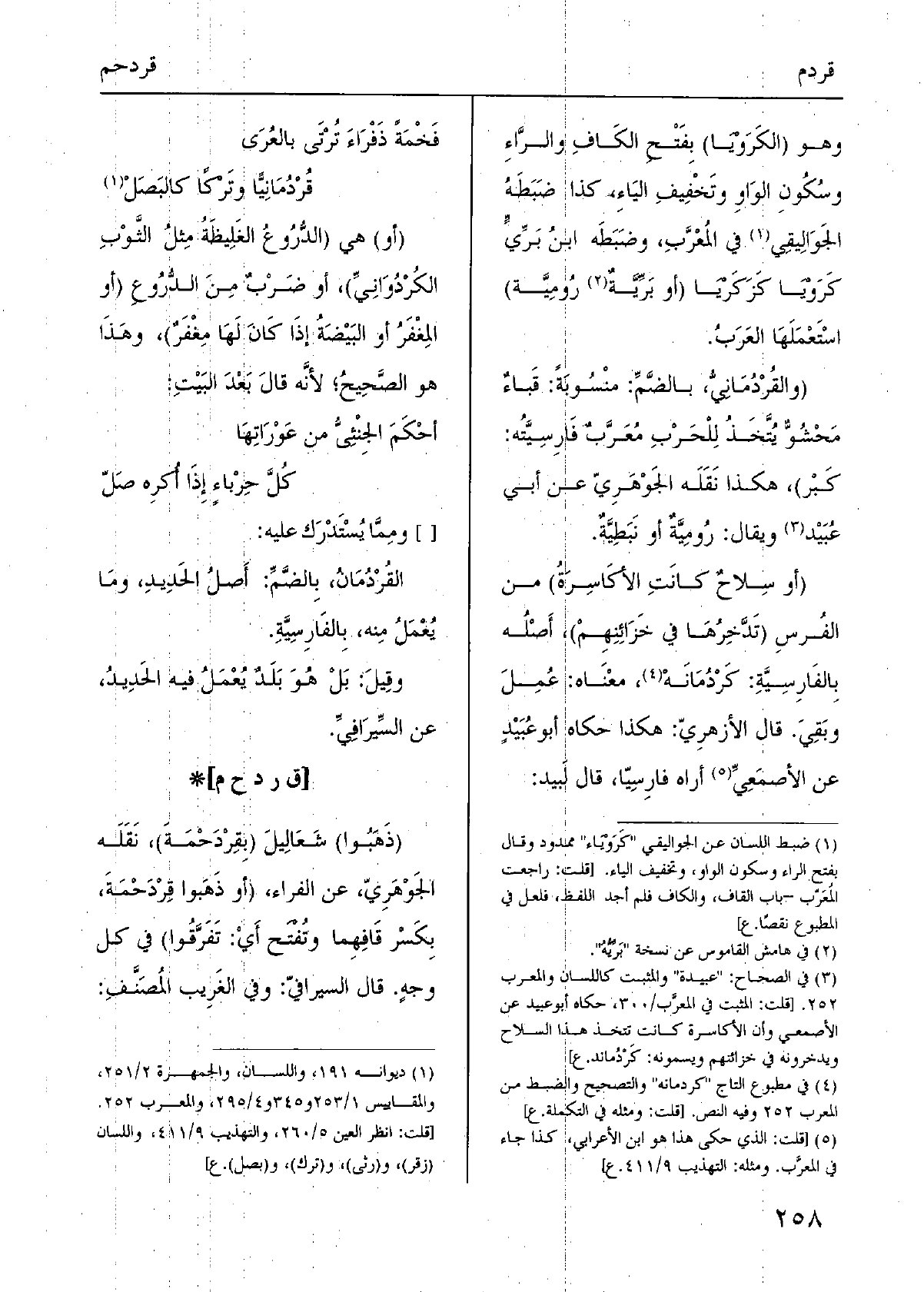 (أَو سِلاحٌ كانَتِ الأكَاسِرَةُ) من الفُرسِ (تَدَّخِرُهَا فِي خَزَائِنِهِمْ) ، أَصْلُه بِالفَارِسِيَّةِ: كَرْدُمَانَهْ، معْنَاه: عُمِلَ وبَقِيَ. قَالَ الأزهرِيّ: هَكَذَا حَكَاهُ أَبُو عُبَيْدٍ عَن الأصمَعِيِّ أرَاهُ فارِسِيّا، قَالَ لَبيد: