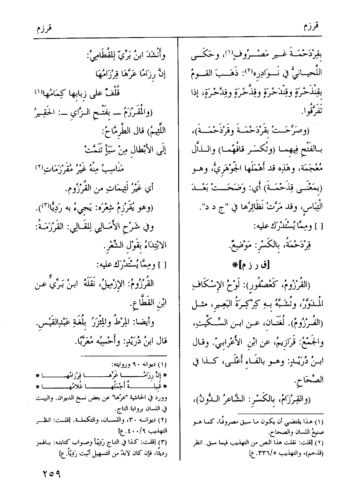 وَفِي شَرْحِ الأَمَالِي لِلقَالِي: القَرْزَمَةُ: الابْتِدَاءُ بِقَوْلِ الشِّعْرِ. [] ومِمَّا يُسْتَدْرَك عَلَيْهِ:
