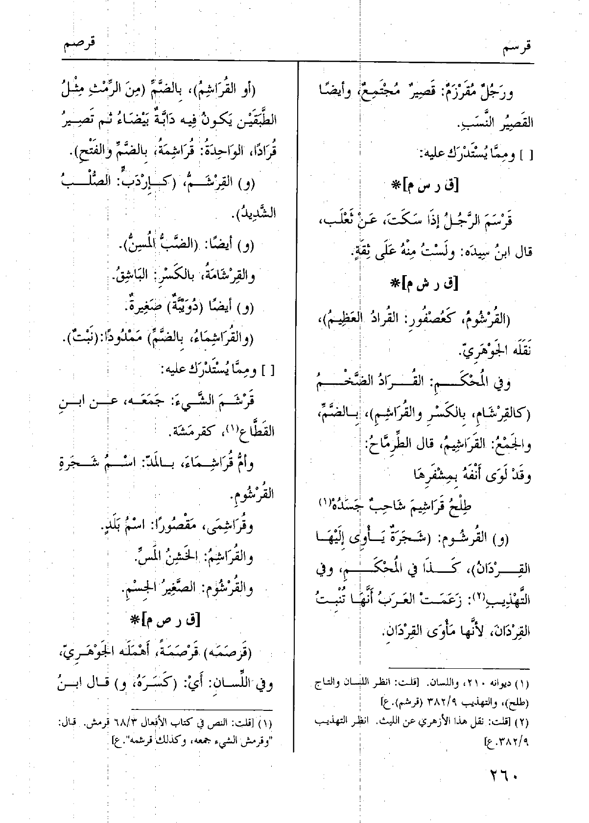 وَفِي المُحْكَمِ: القُرَادُ الضَّخْمُ (كالقِرْشَامِ، بِالكَسْرِ والقُرَاشِمِ) ، بِالضَّمِّ، والجَمْعُ: القَرَاشِيمُ، قَالَ الطِّرِمَّاحُ: