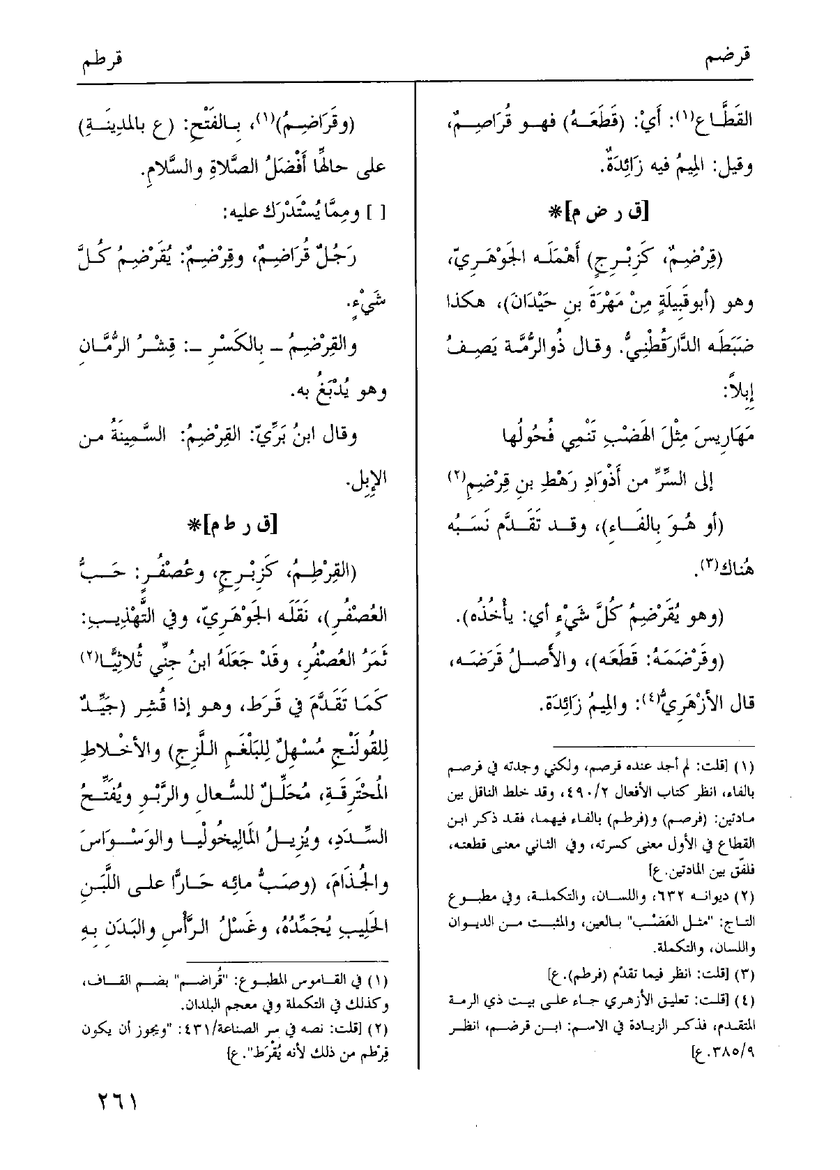 (وَهُوَ يُقَرْضِمُ كُلَّ شَيْءٍ أَي: يأْخُذُه) . (وقَرْضَمَهُ: قَطَعَه) ، والأَصلُ قَرَضَه، قَالَ الأزْهَرِيُّ: والمِيمُ زَائِدَة.