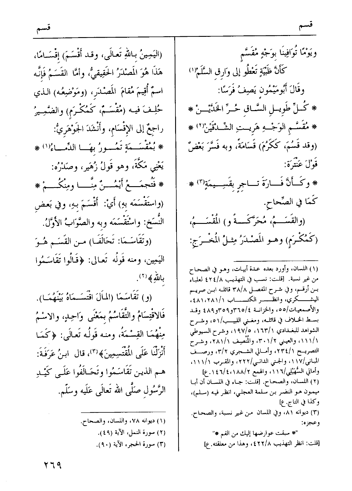 (و) تَقَاسَمَا (المَالَ اقْتَسَمَاهُ بَيْنَهُمَا) . فَالاقْتِسَامُ والتَّقَاسُمُ بِمَعْنَى وَاحِدٍ، والاسْمُ مِنْهُمَا القِسْمَةُ، وَمِنْه قَولُه تَعالَى: {كَمَا أنزلنَا على المقتسمين} ، قَالَ ابنُ عَرَفَةَ: هم الَّذين تَقَاسَمُوا وتَحَالَفُوا عَلَى كَيْدِ الرَّسُولِ صَلَّى الله تَعالَى عَلَيه وسَلّم.