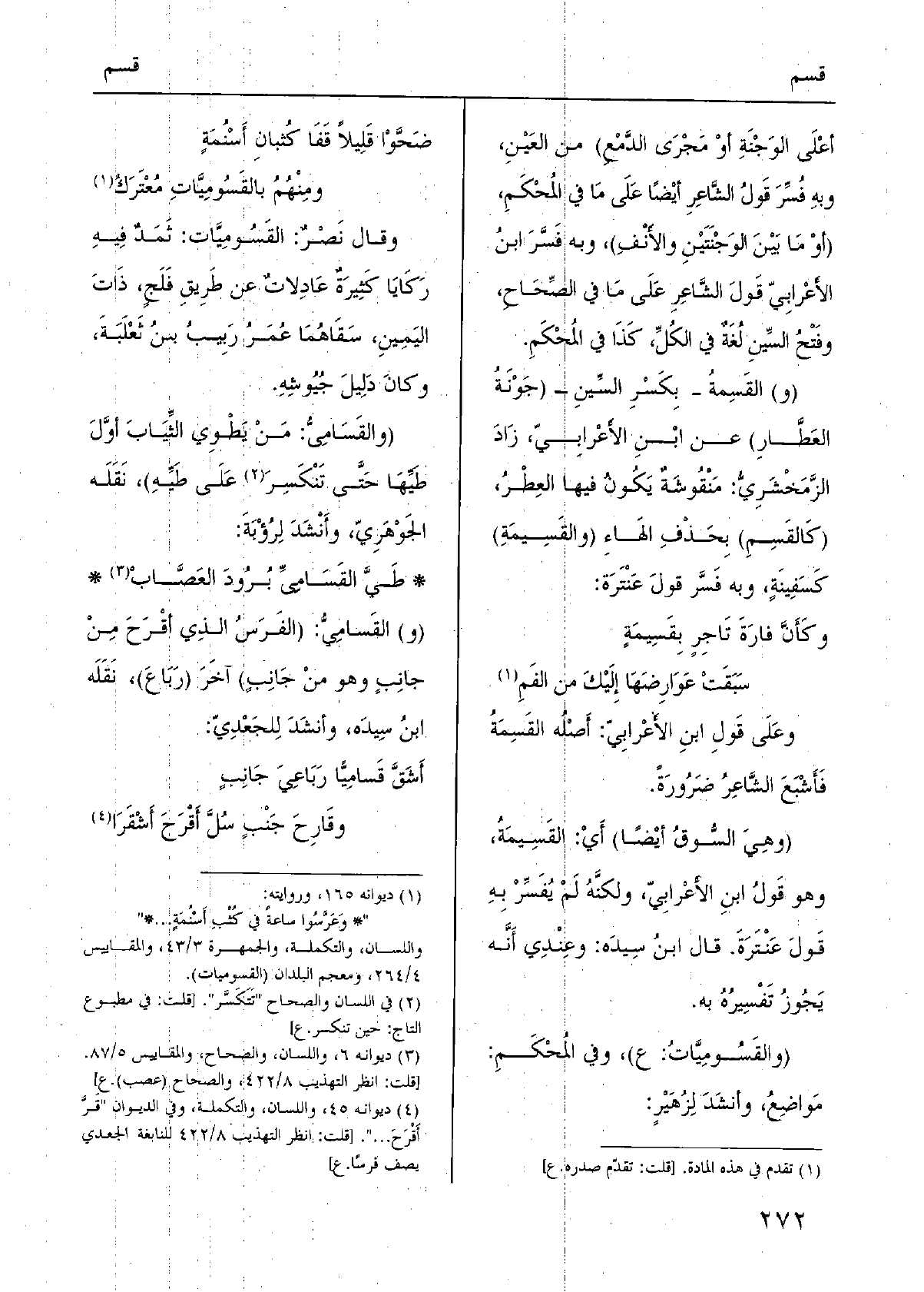 وعَلَى قَولِ ابنِ الأَعْرابِيّ: أَصْلُه القَسِمَةُ فَأَشْبَعَ الشَّاعِرُ ضَرُورَةً.
