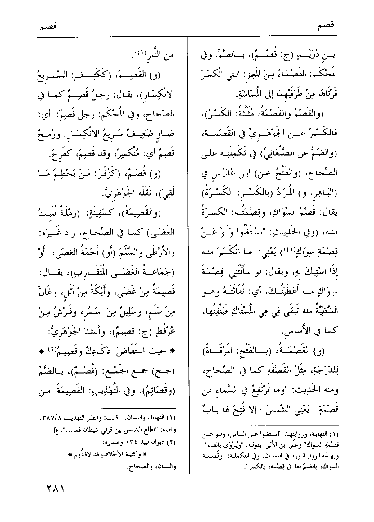 ابنِ دُرَيْدٍ (ج: قُصْمٌ) ، بالضَّمِّ. وَفِي المُحْكَم: القَصْمَاءُ مِنَ المَعِزِ: الَّتِي انْكَسَرَ قَرْنَاهَا مِنْ طَرَفَيْهِمَا إِلَى المُشَاشَةِ.